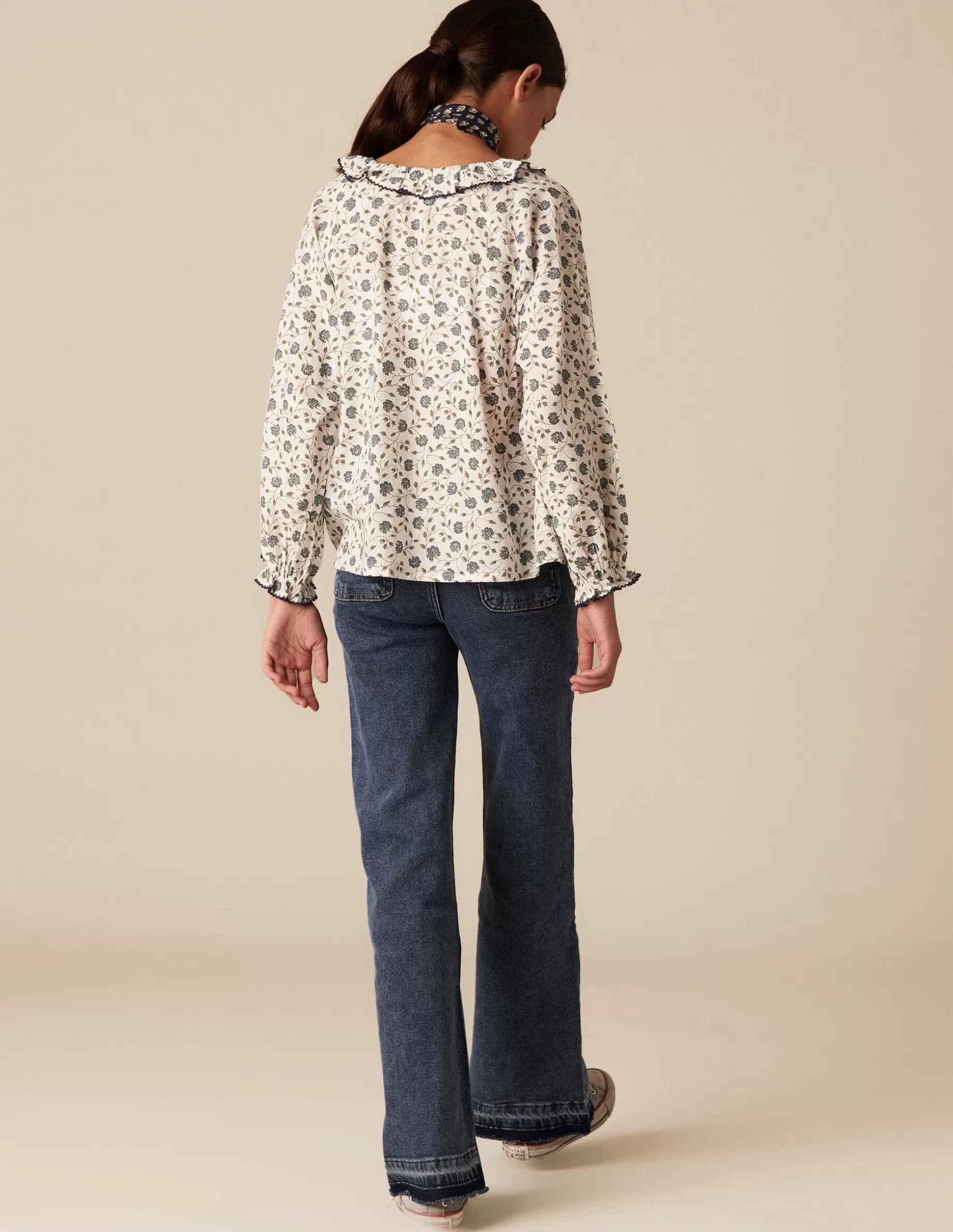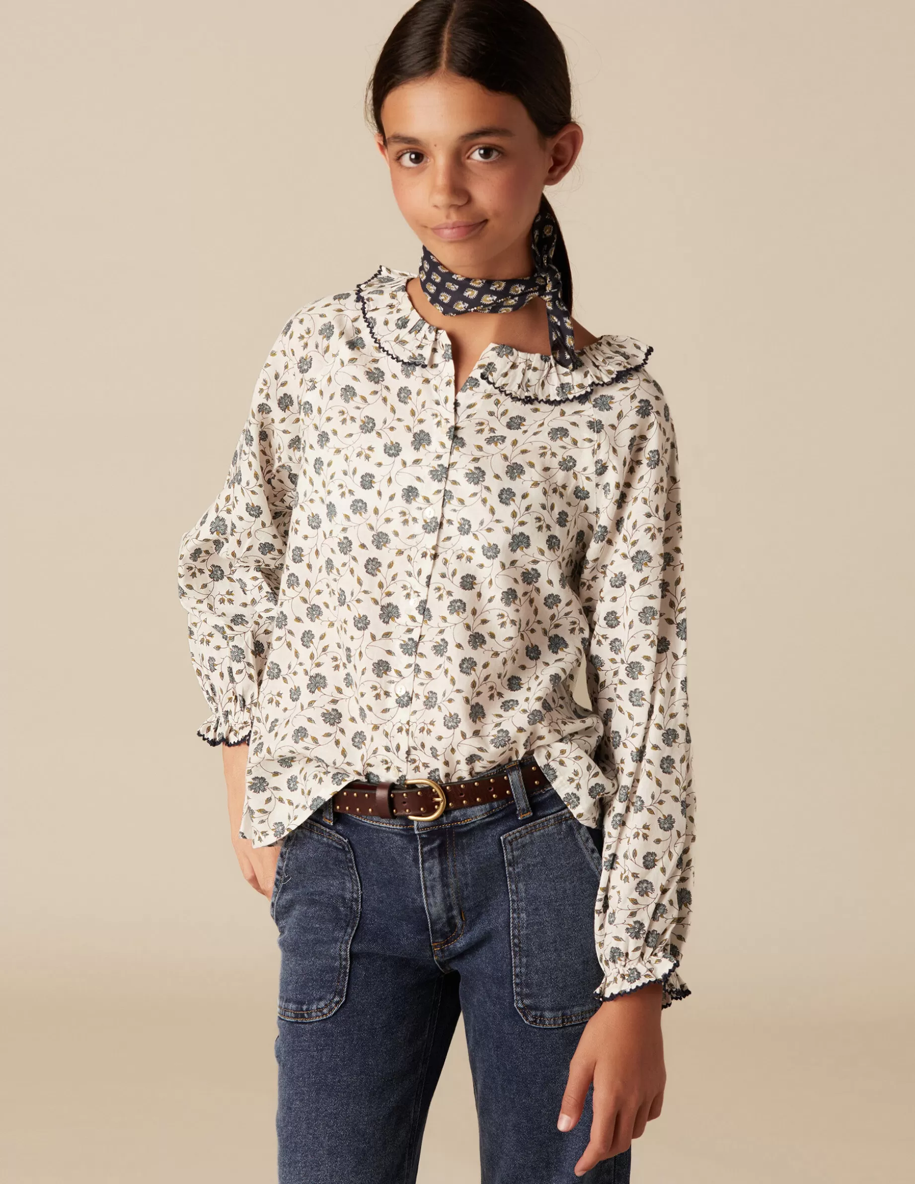 Camisa de teen , en estampado de la colección. Patrón con cuello perkins y cierre por la espalda con botones. Detalle de pespunte a contraste en cuello y mangas.