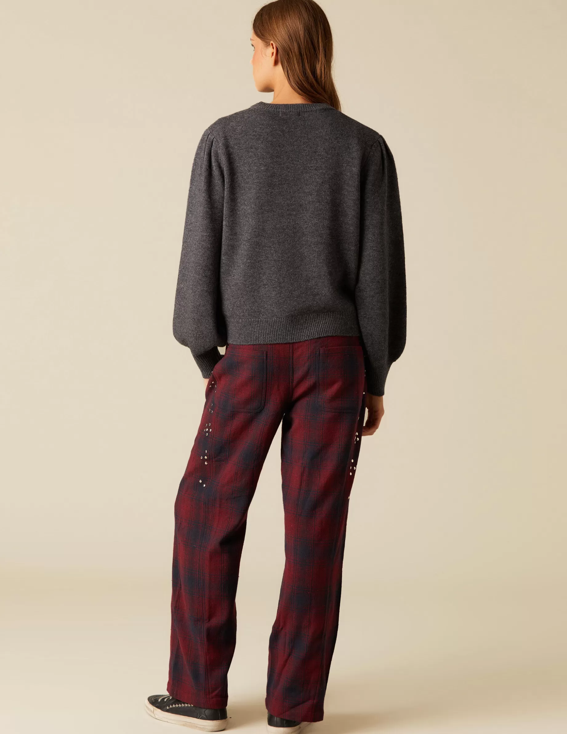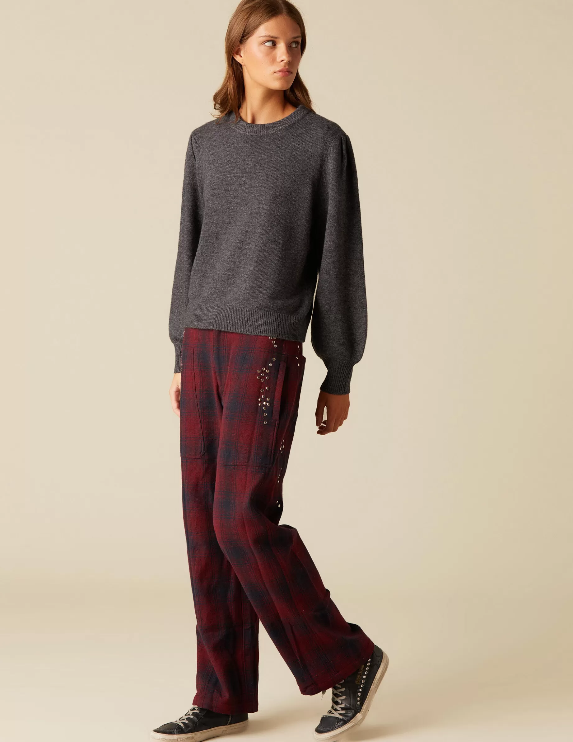 Jersey gris marengo manga farol y cuello redondo.