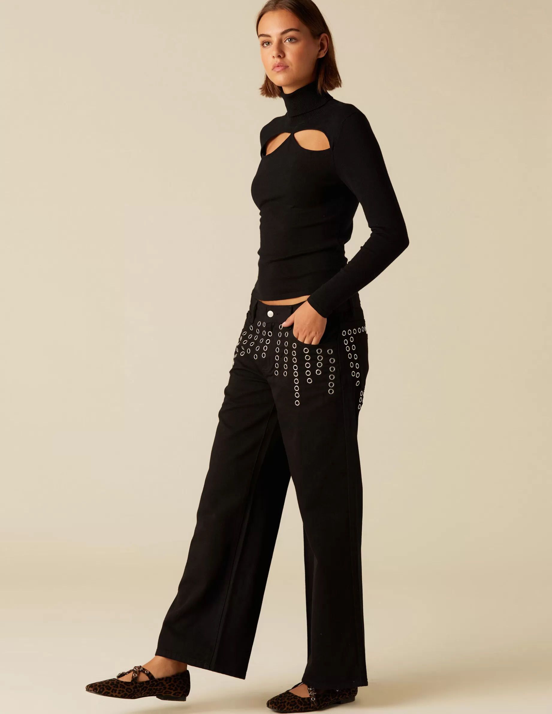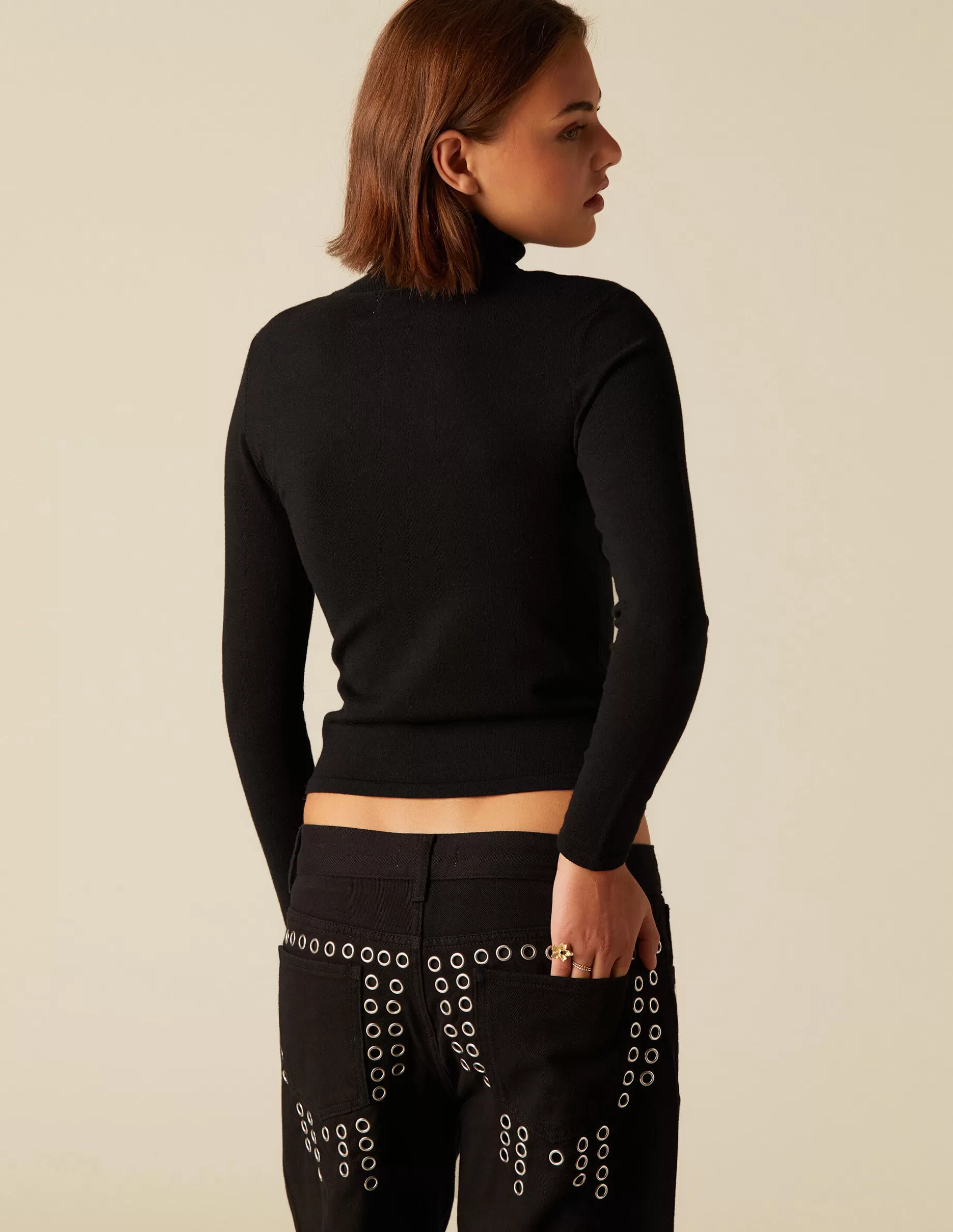 Top de manga larga con cuello vuelto y abertura en el delantero en color negro.