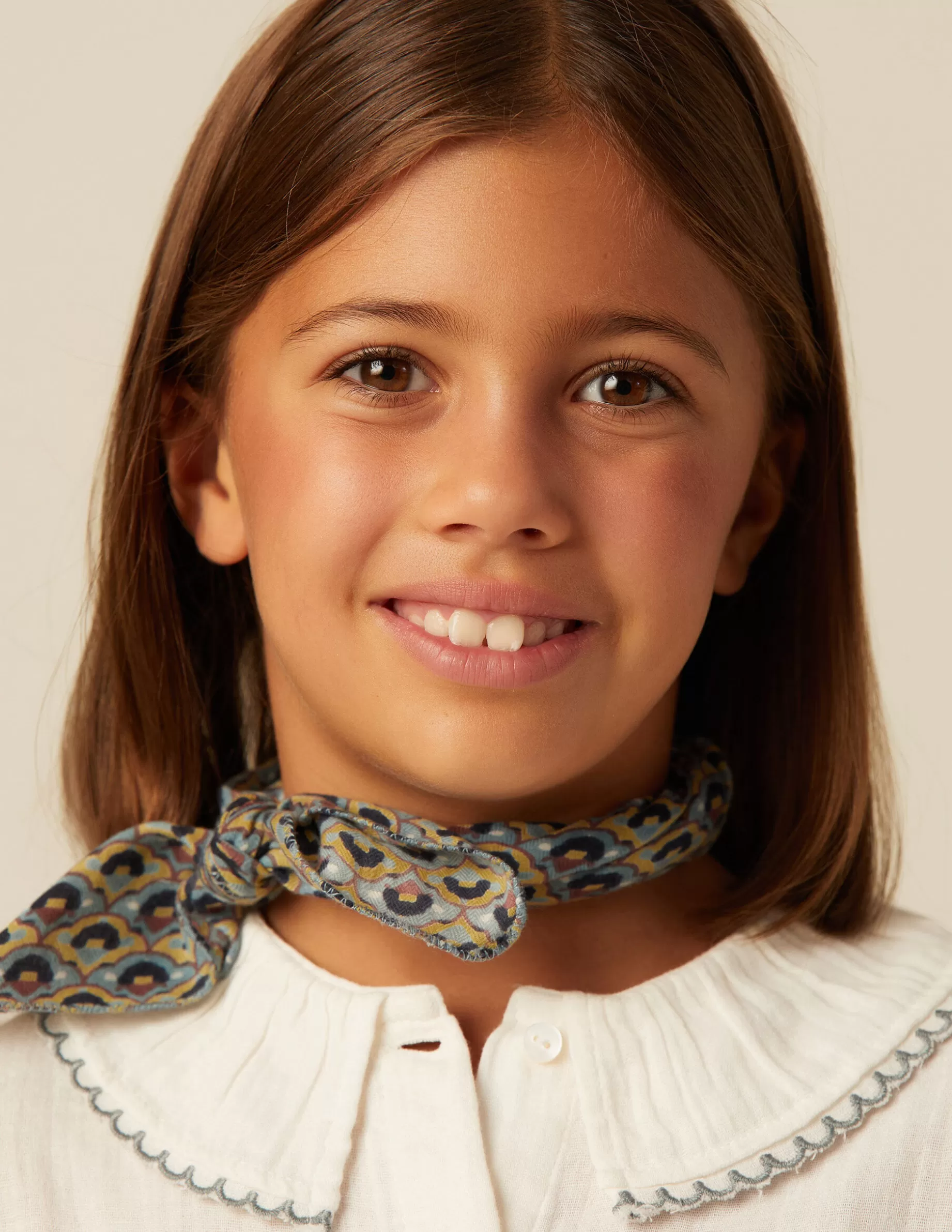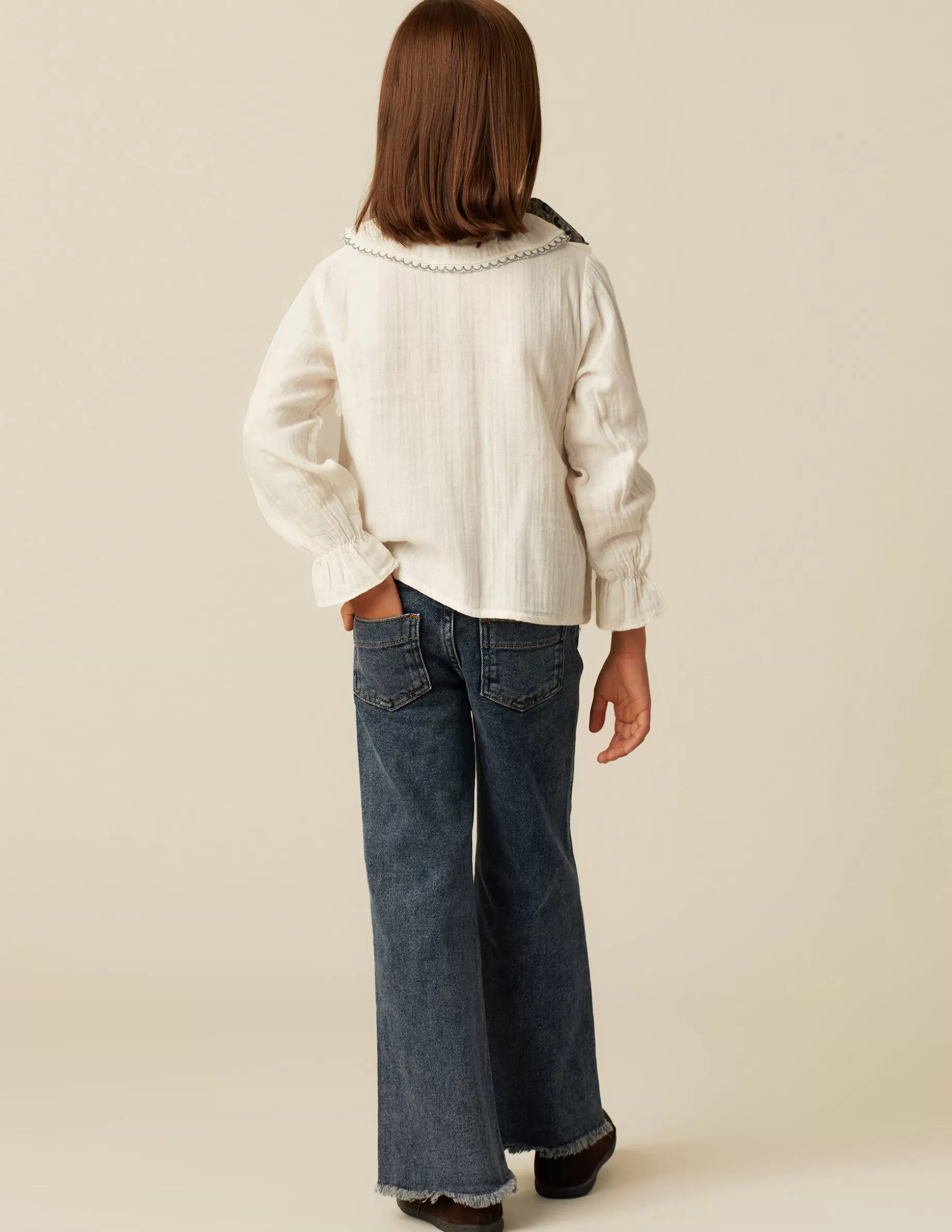 Camisa de niña cruda, con detalle de bordado en color de la colección en el cuello. Cierre con botones frontales.