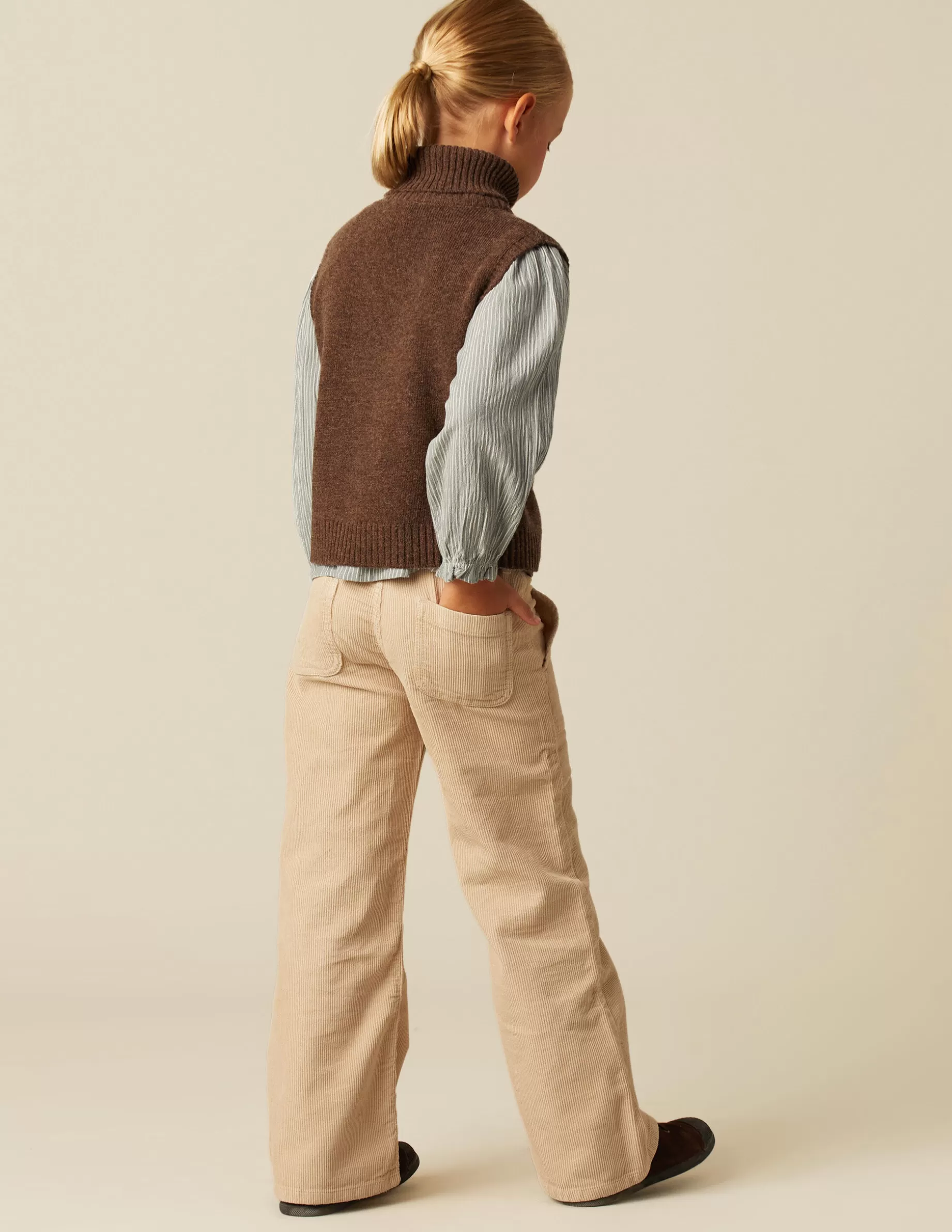Pantalón wide leg de pana arena con bolsillos. Cierre con botón metálico y cremallera.