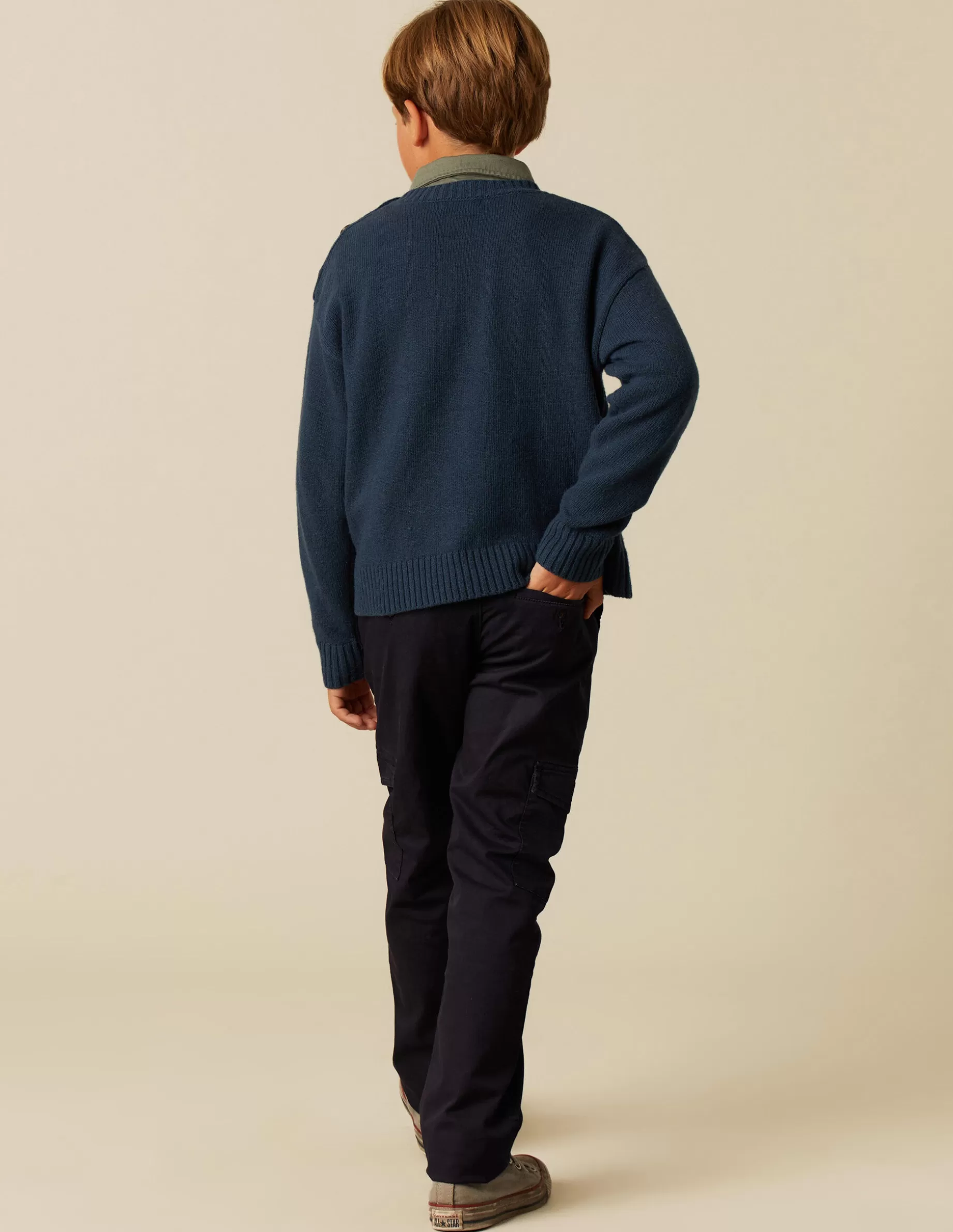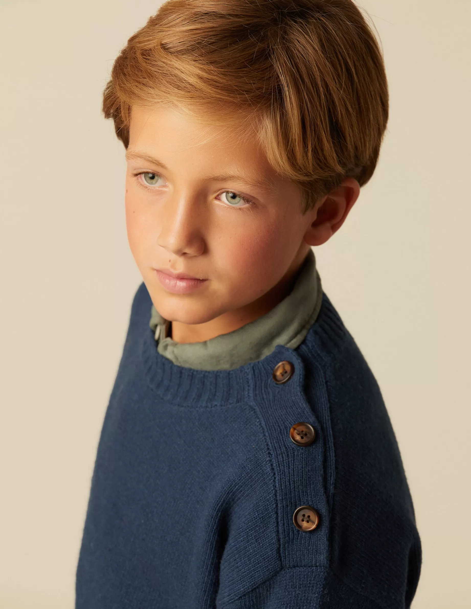 Jersey con acabados en canalé color azul. Detalle de botones en hombro.
