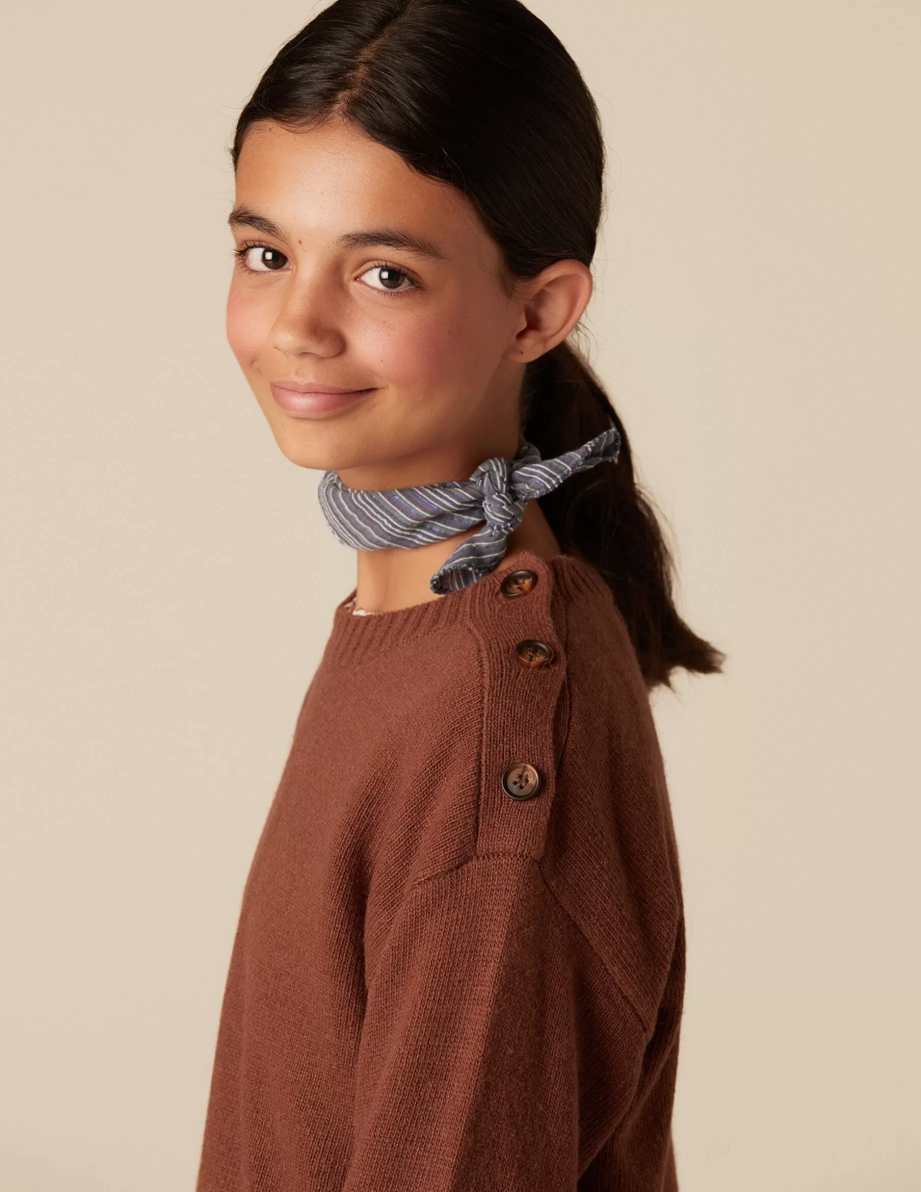 Jersey con acabados en canalé color marrón. Detalle de botones en hombro.