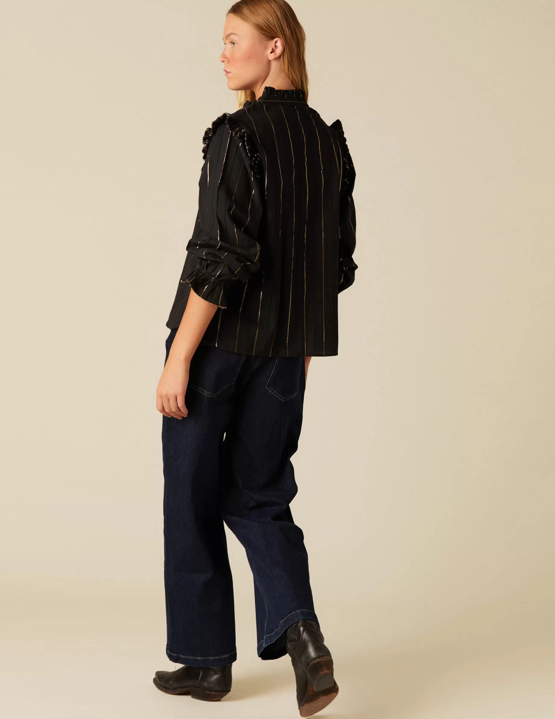 Camisa de chica, en tejido listo con raya lurex dorada. Patrón con manga larga, volante en el hombro y cierre delantero…