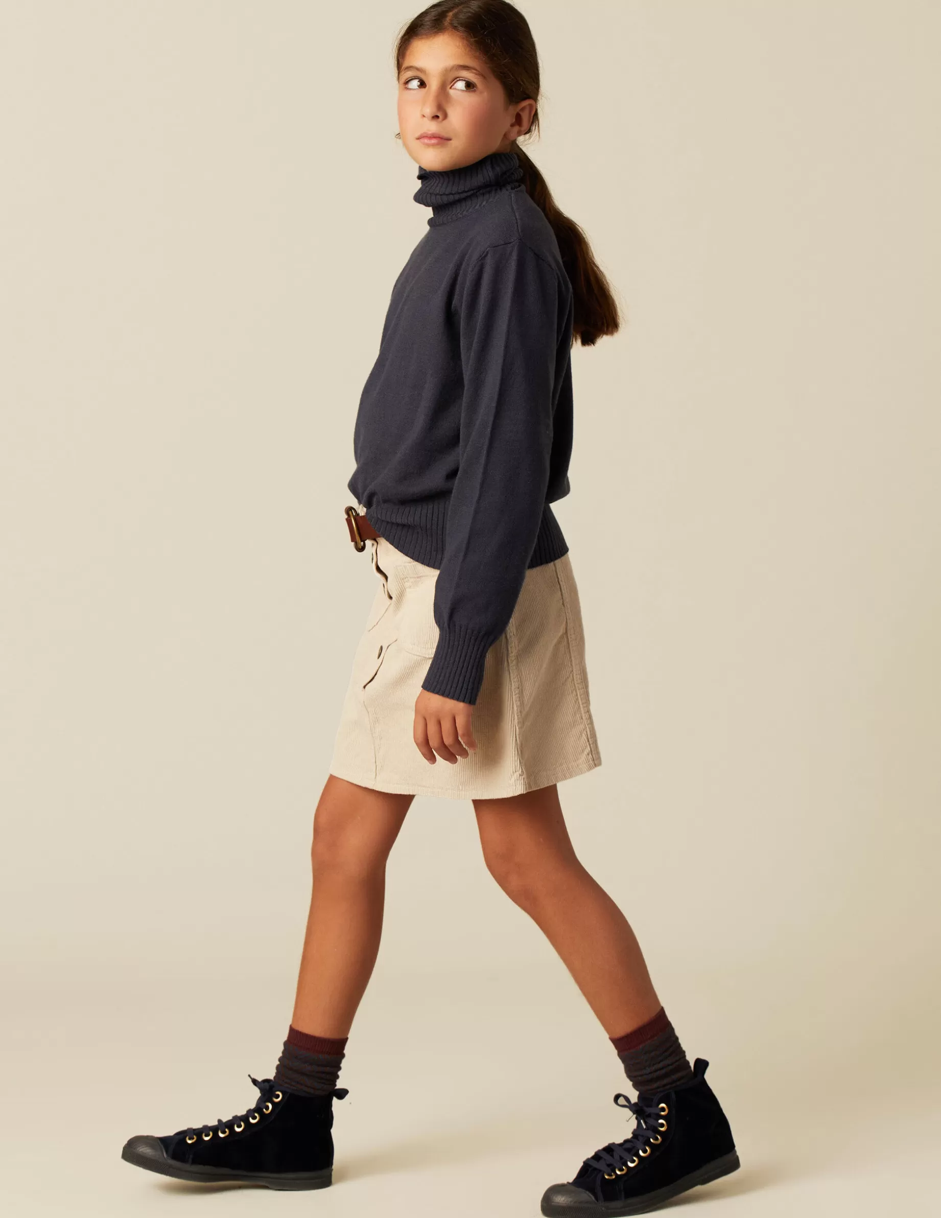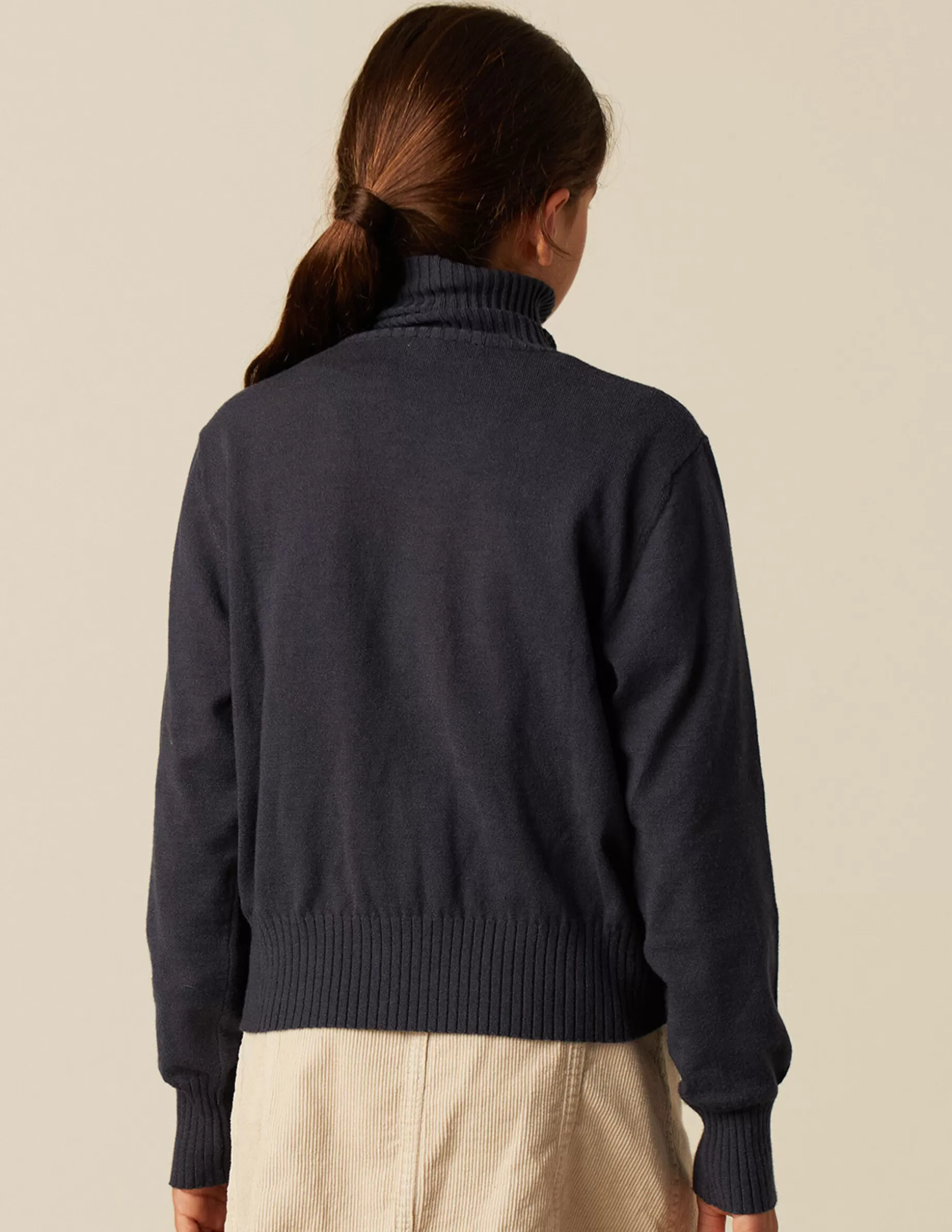 Jersey de punto en color azul. Patrón de cuello vuelto y manga larga.