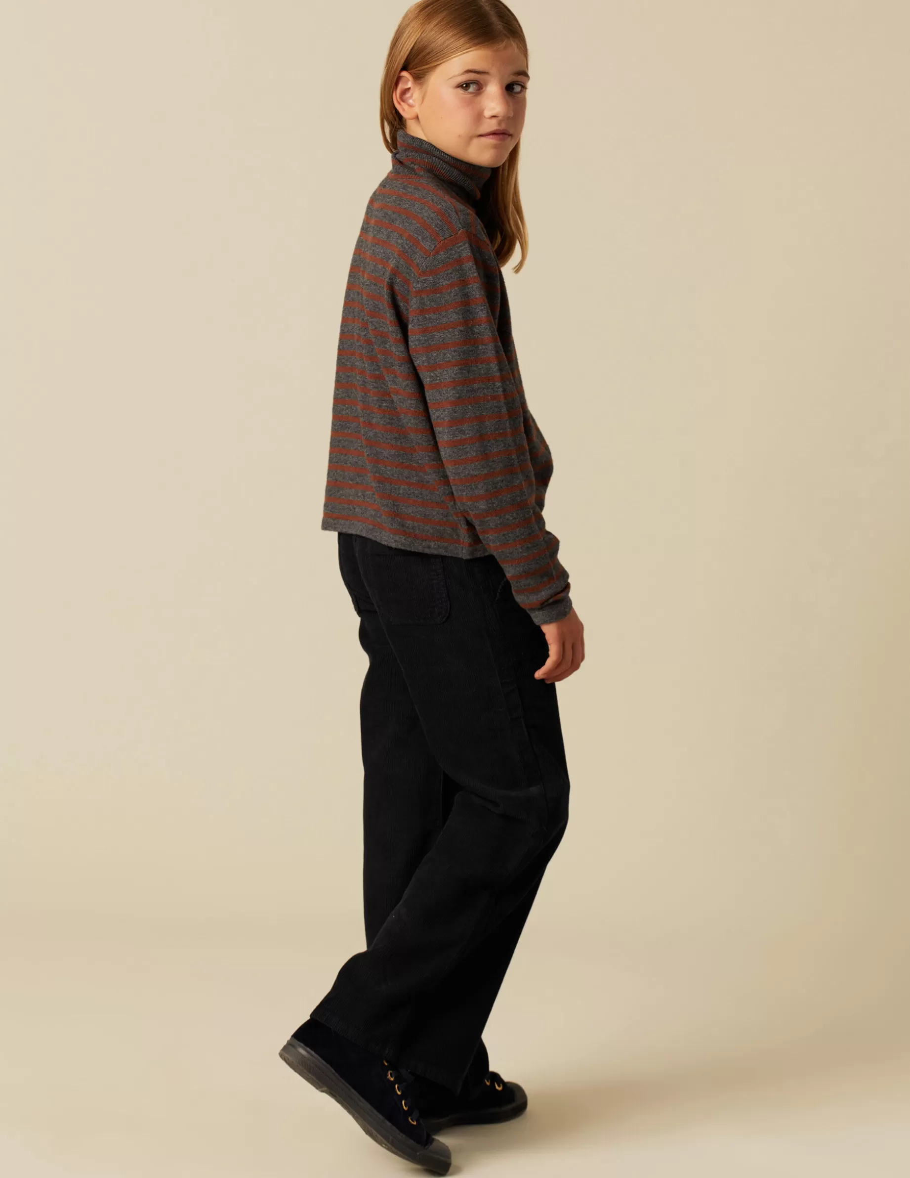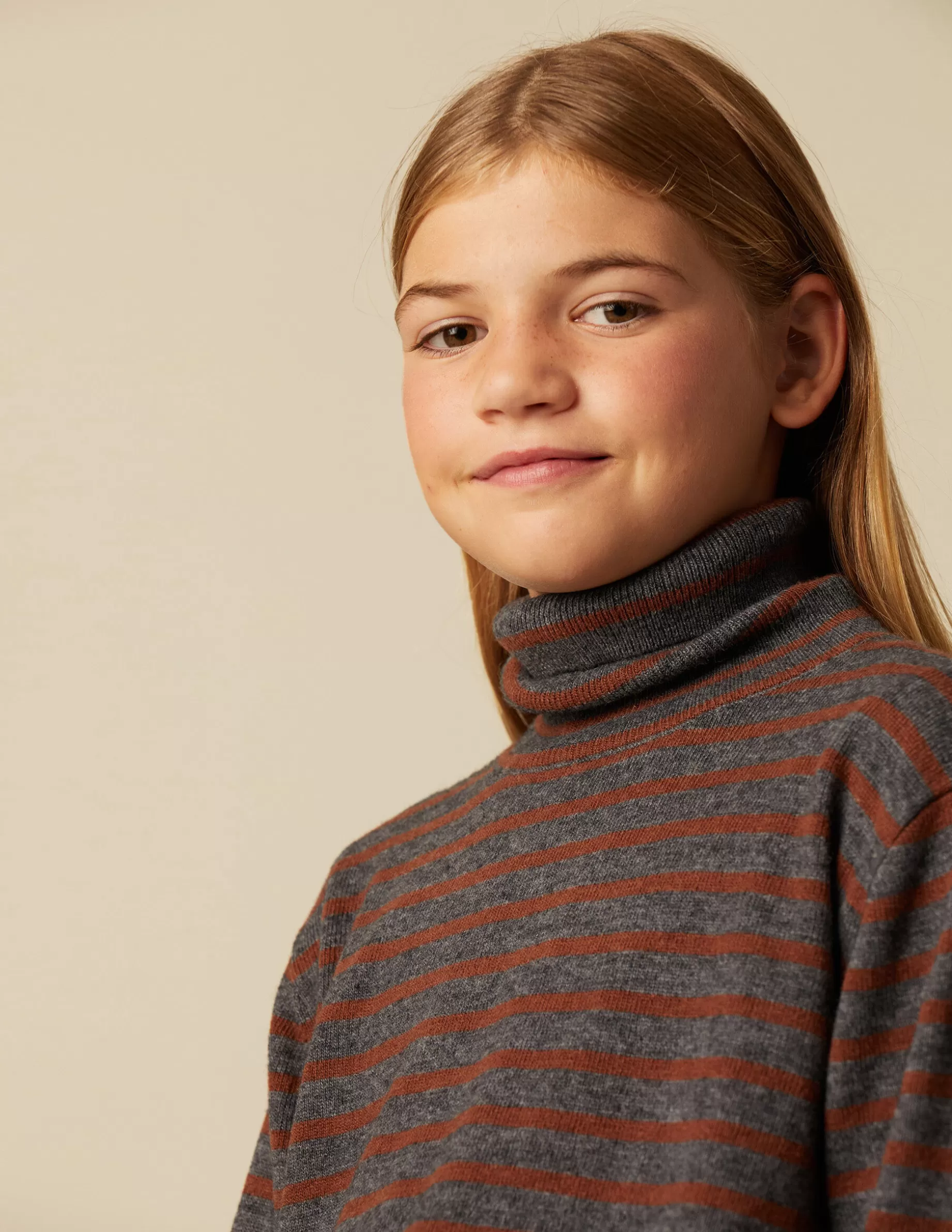 Jersey en punto de rayas en colores marrón y marengo. Patrón de cuello vuelto y manga larga.
