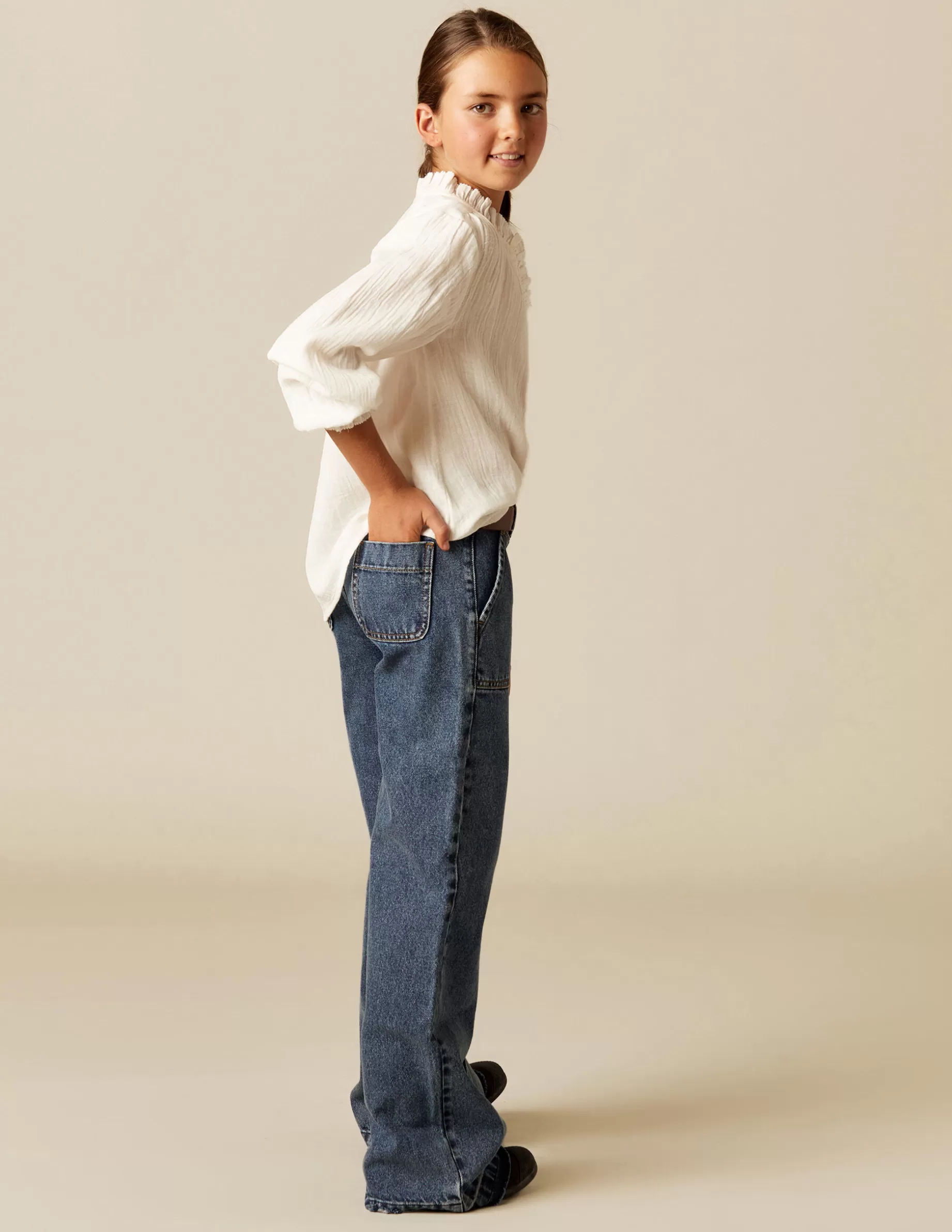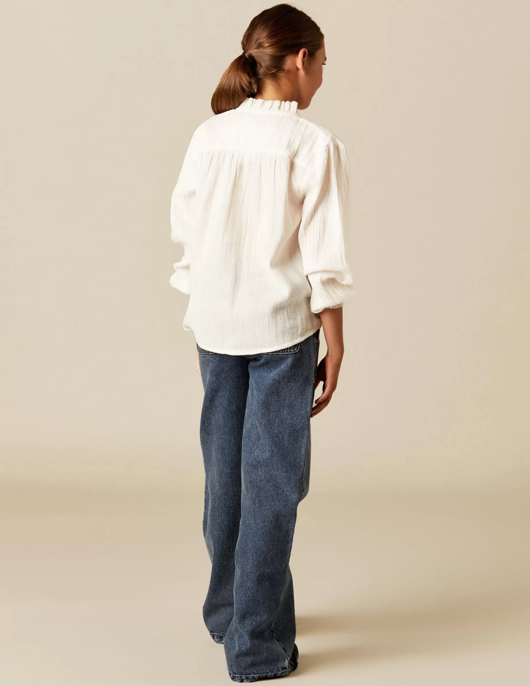 Camisa de teen cruda. Patrón con cuello perkins con un volante, manga larga rematada en volante.