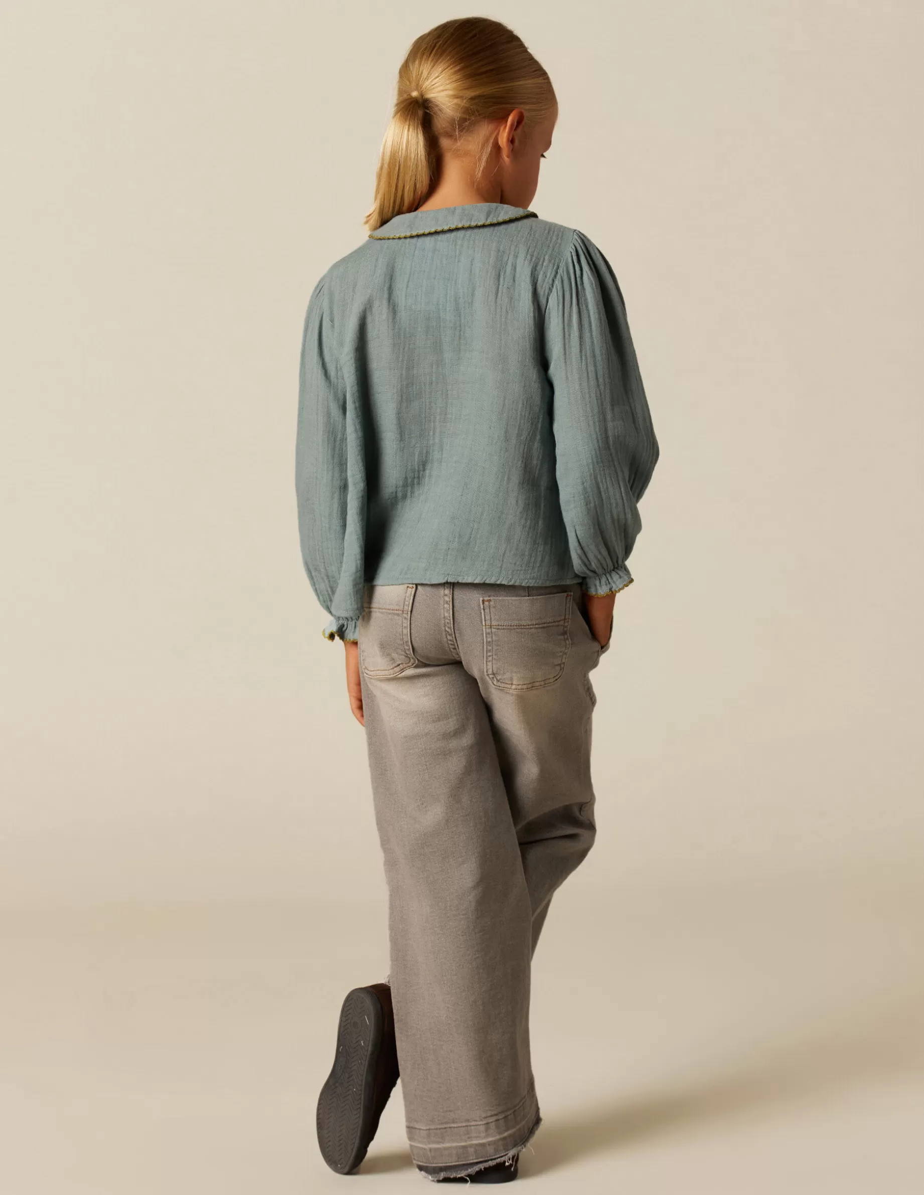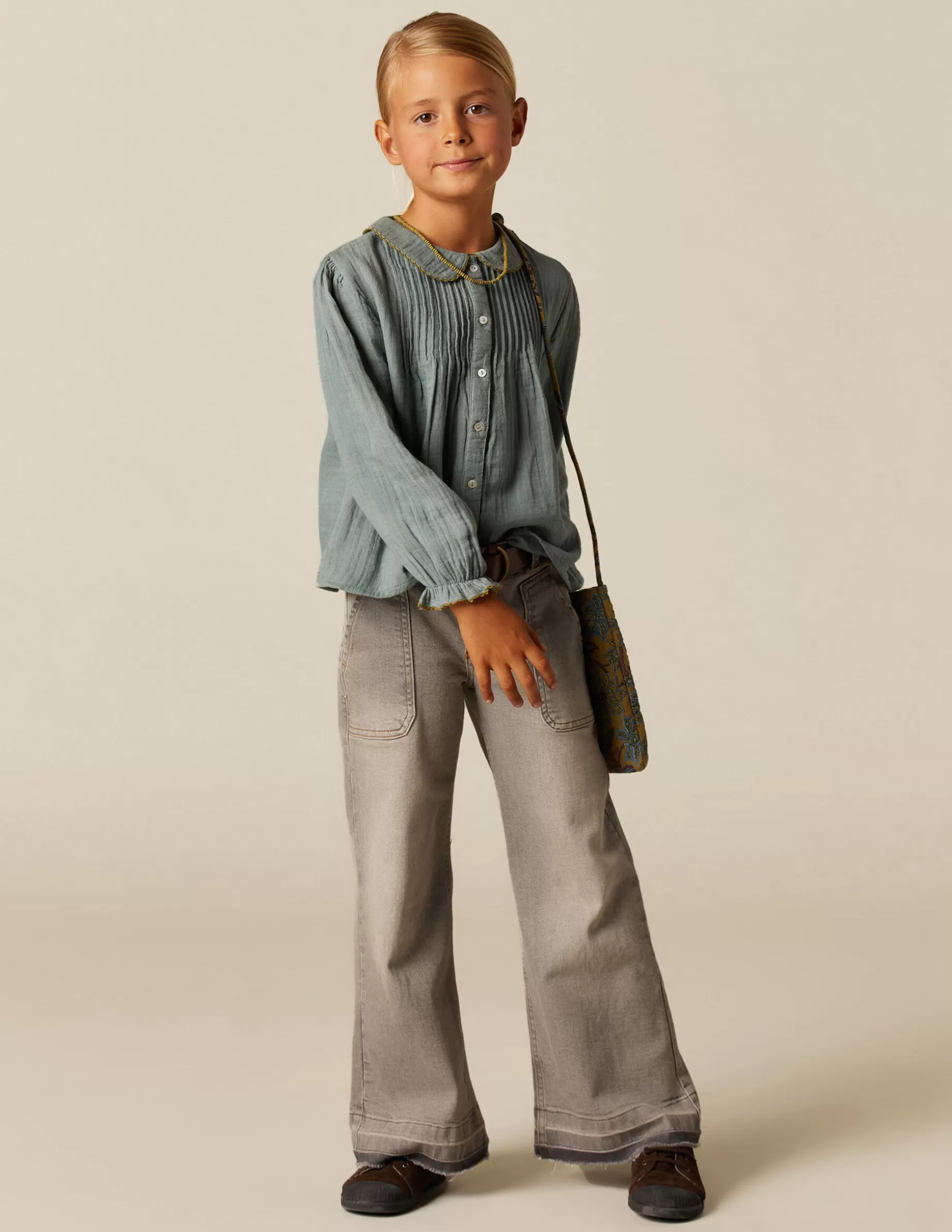 Camisa de niña, en color liso de la colección, con detalle de pespunte a contraste en cuello y mangas. Patrón con cuello bebé, manga larga rematada con volante, y jaretas en la zona delantera.