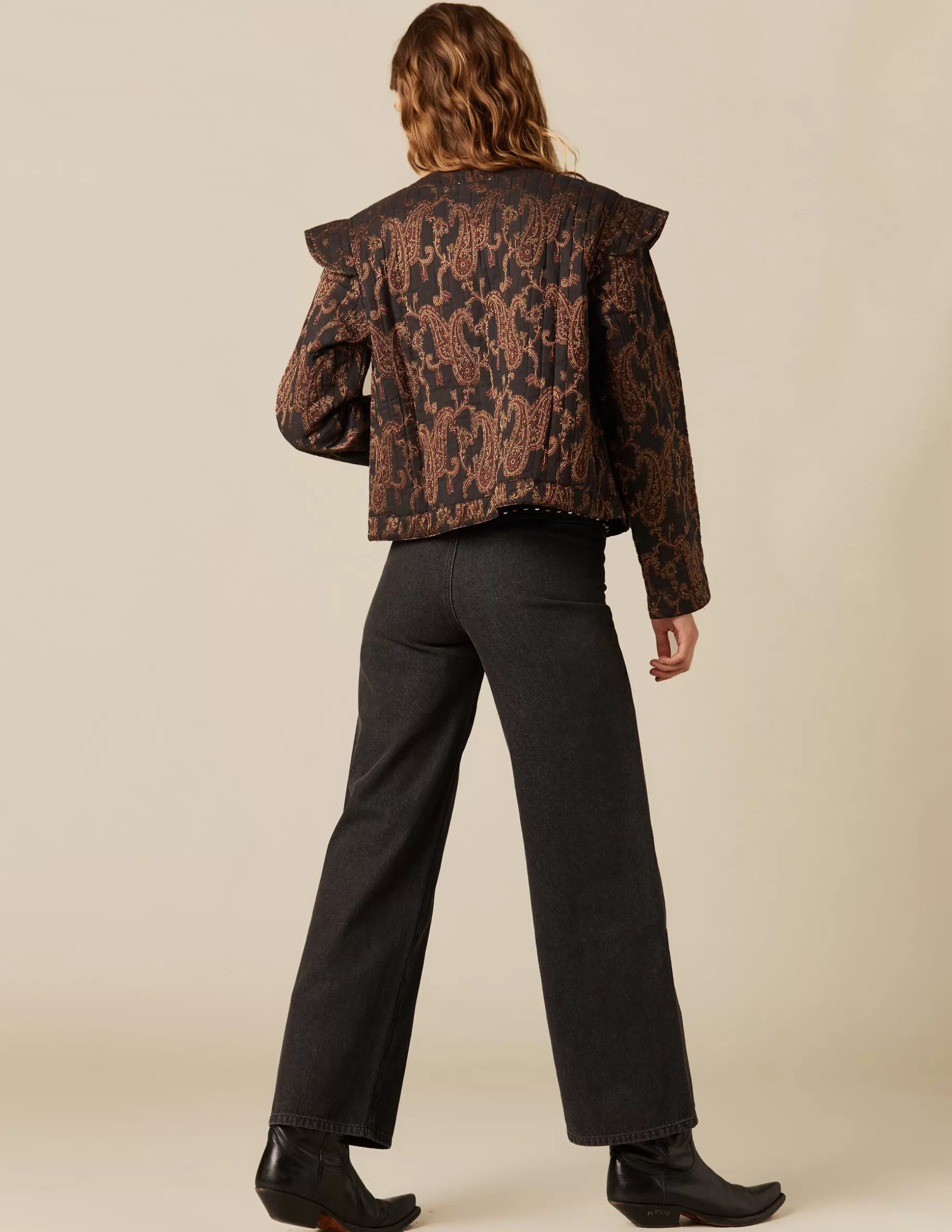 Chaqueta de chica, en un jacquard paisley, en colorido de la colección. Patrón con volante en hombros.