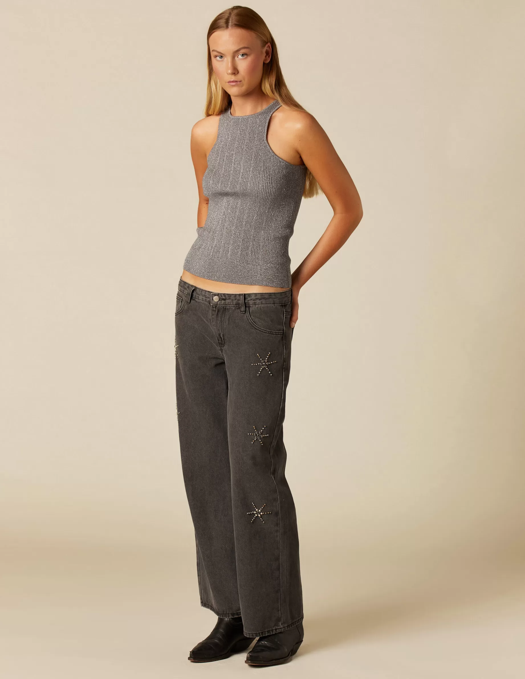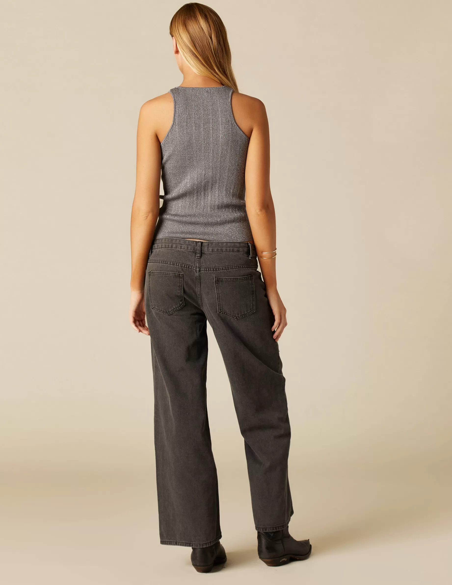 Top canalé de tirantes con escote cerrado plateado.