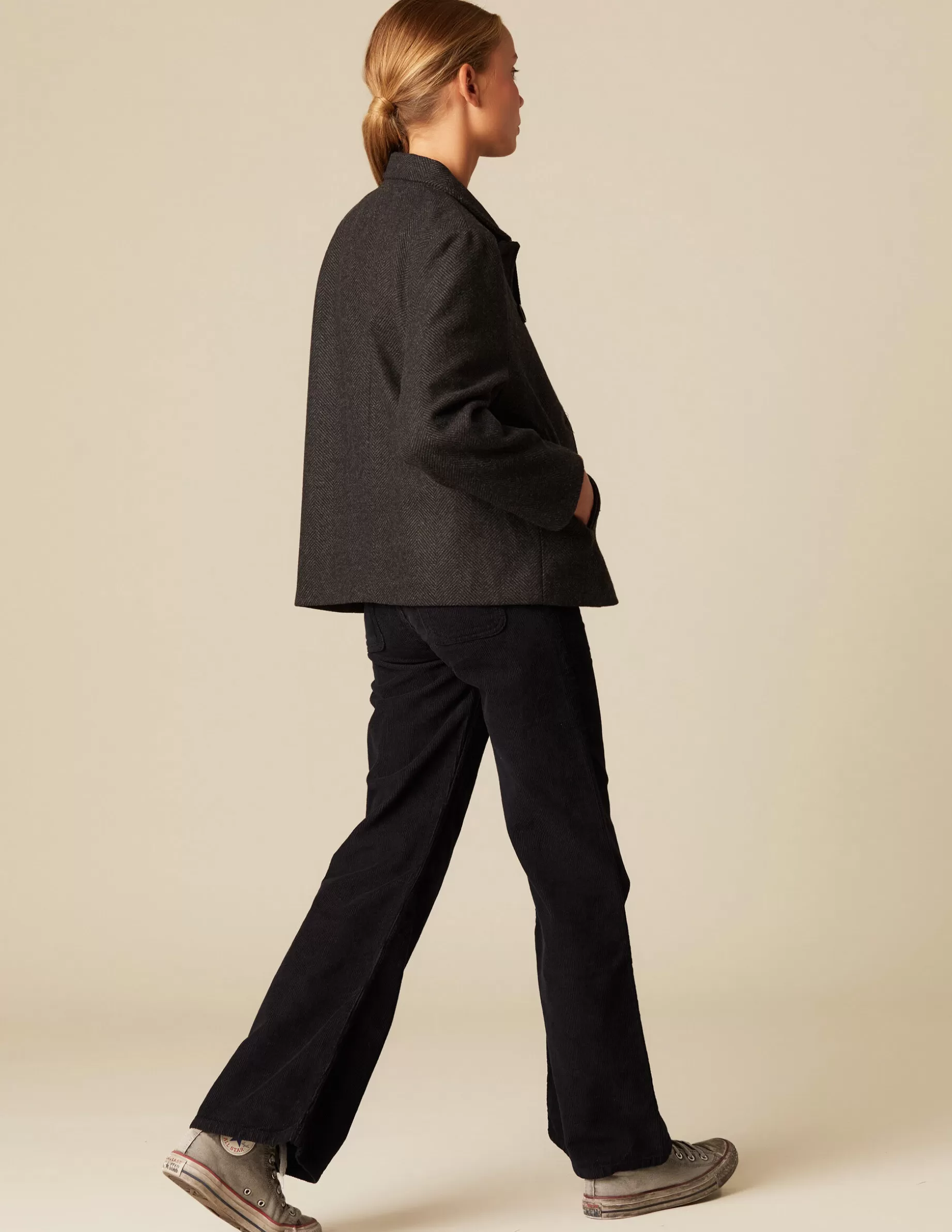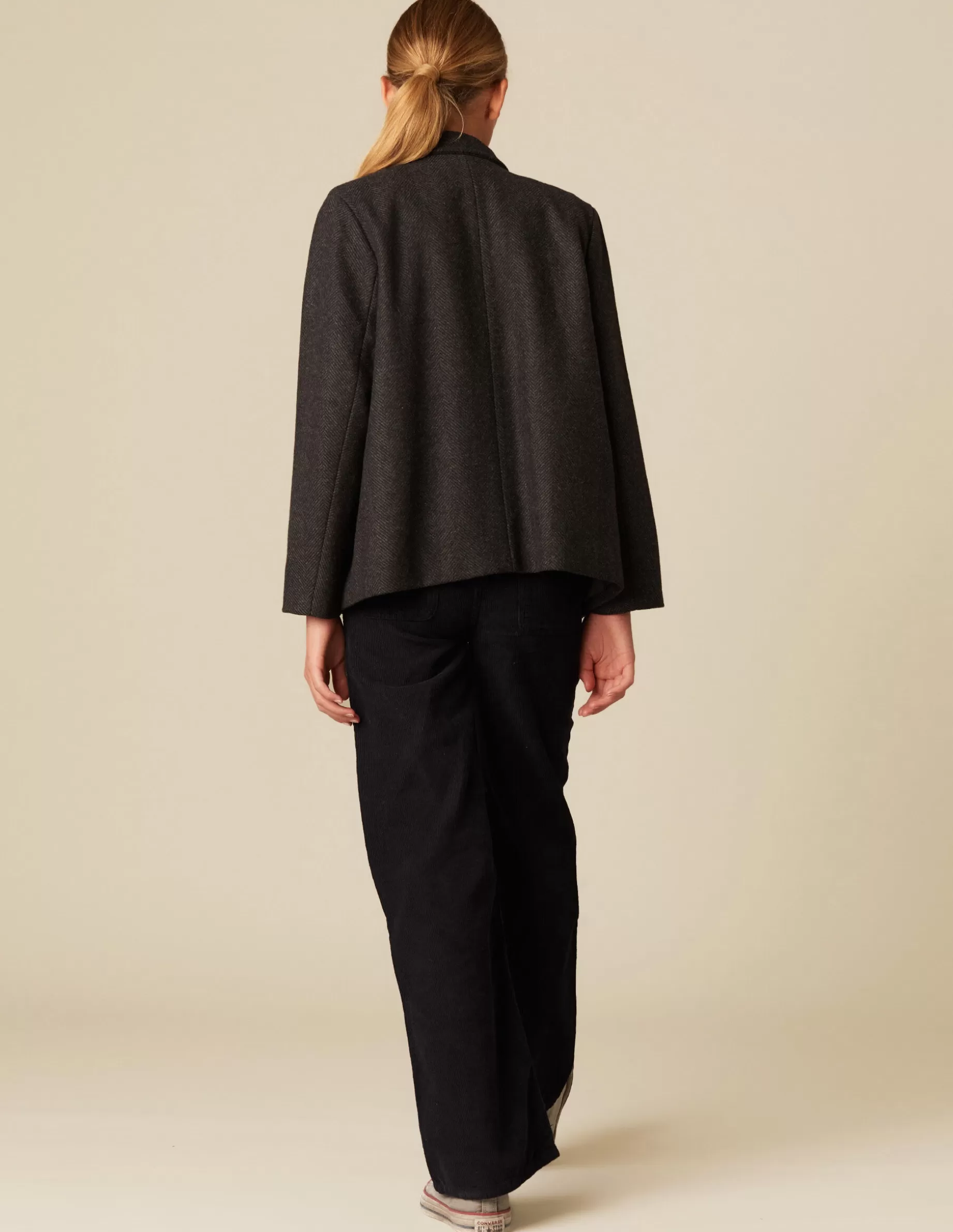 Abrigo cruzado en tejido espiga gris. Cierre con botonadura en delantero.