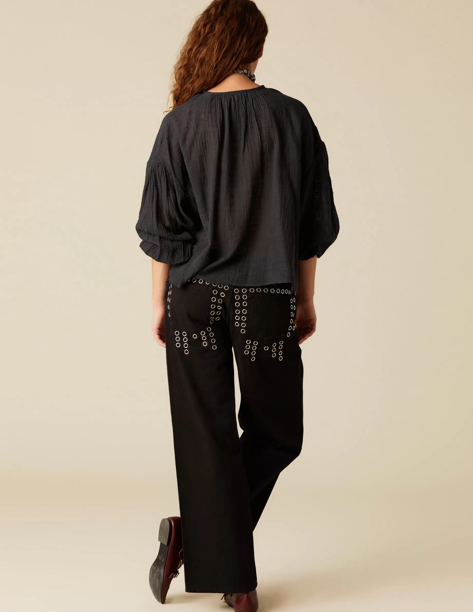 Camisa de chica, en un lino rústico. Patrón con cuello redondo y volante en la zona de la botonadura. Manga larga. Dis…