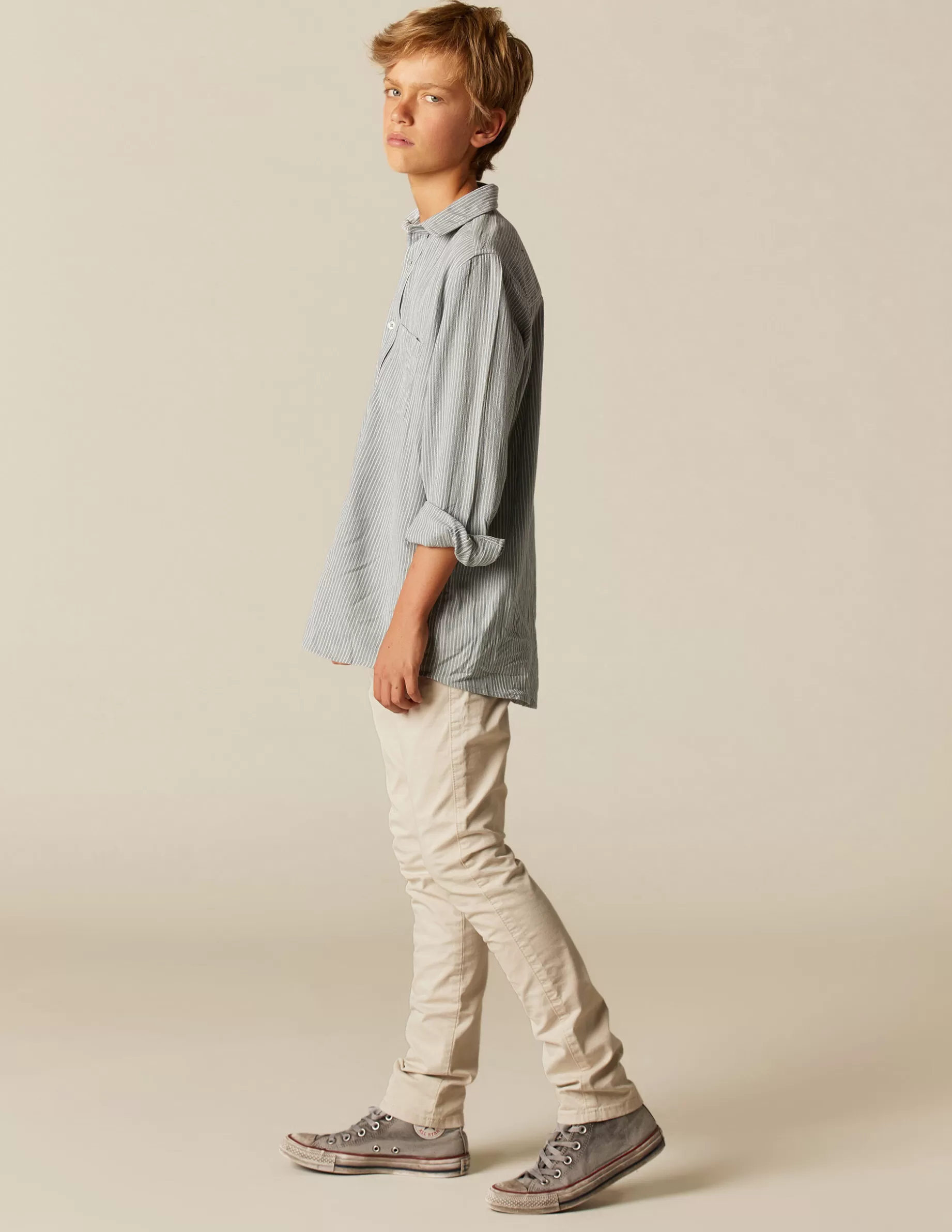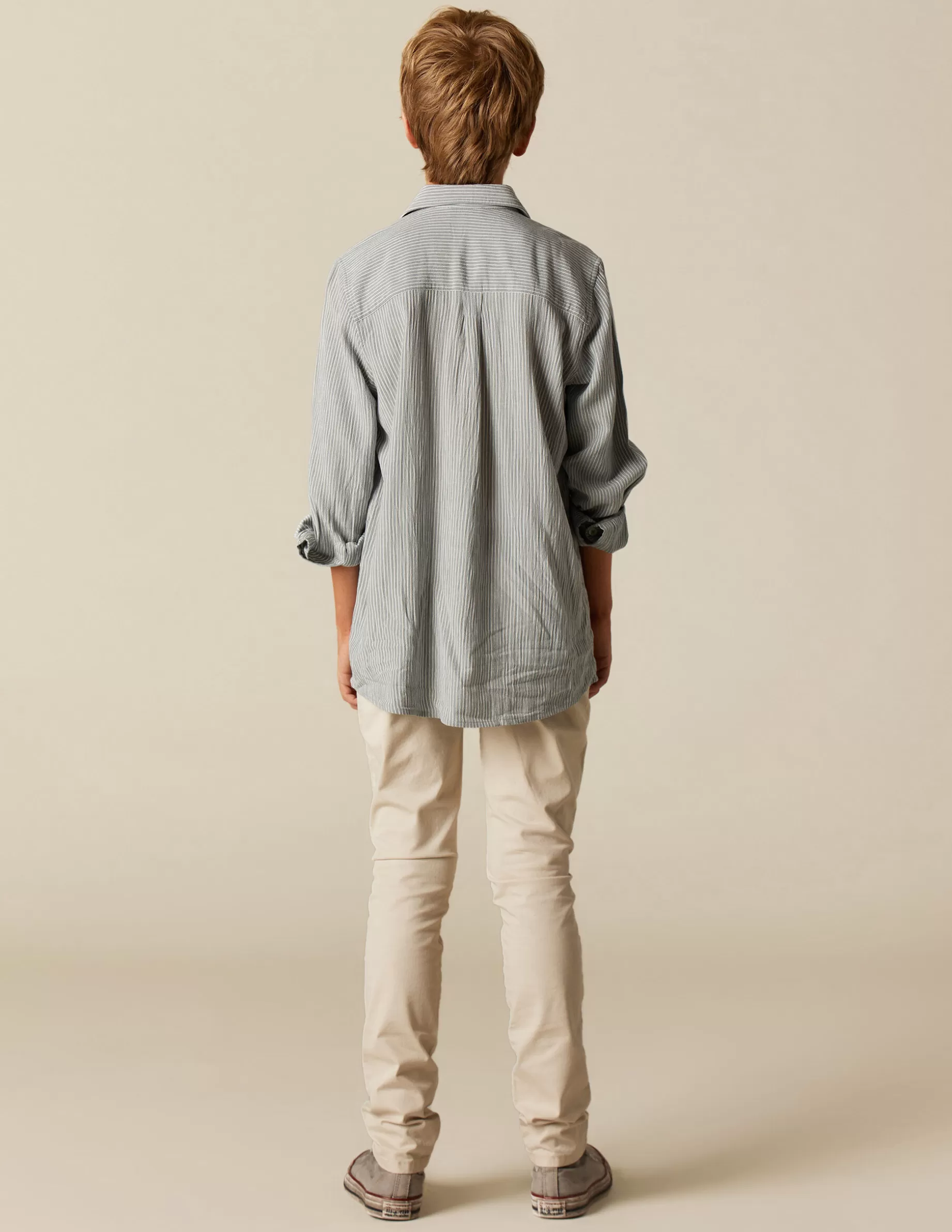 Camisa de teen o, en tejido de algodón de rayas. Patrón cuello pico y manga larga rematada en puño.