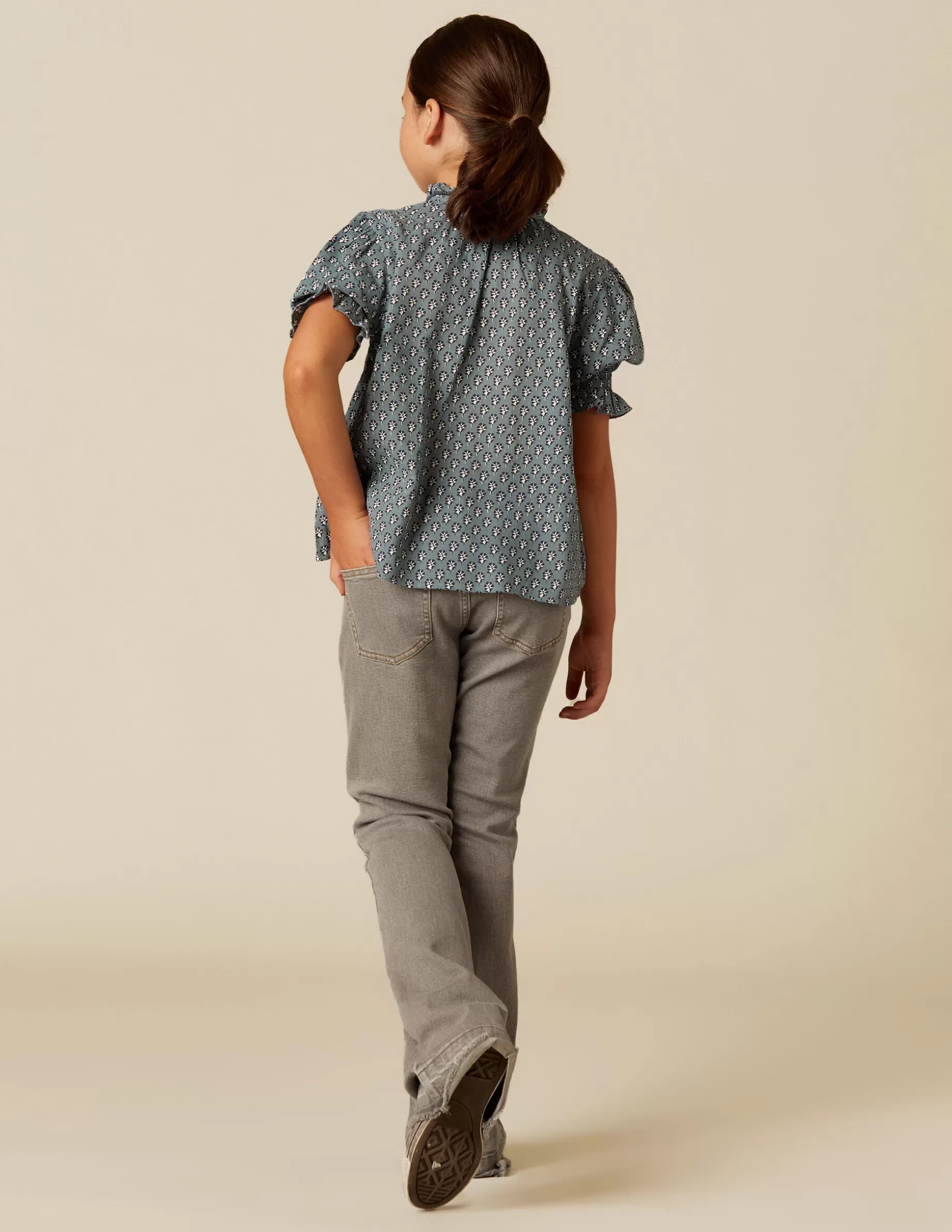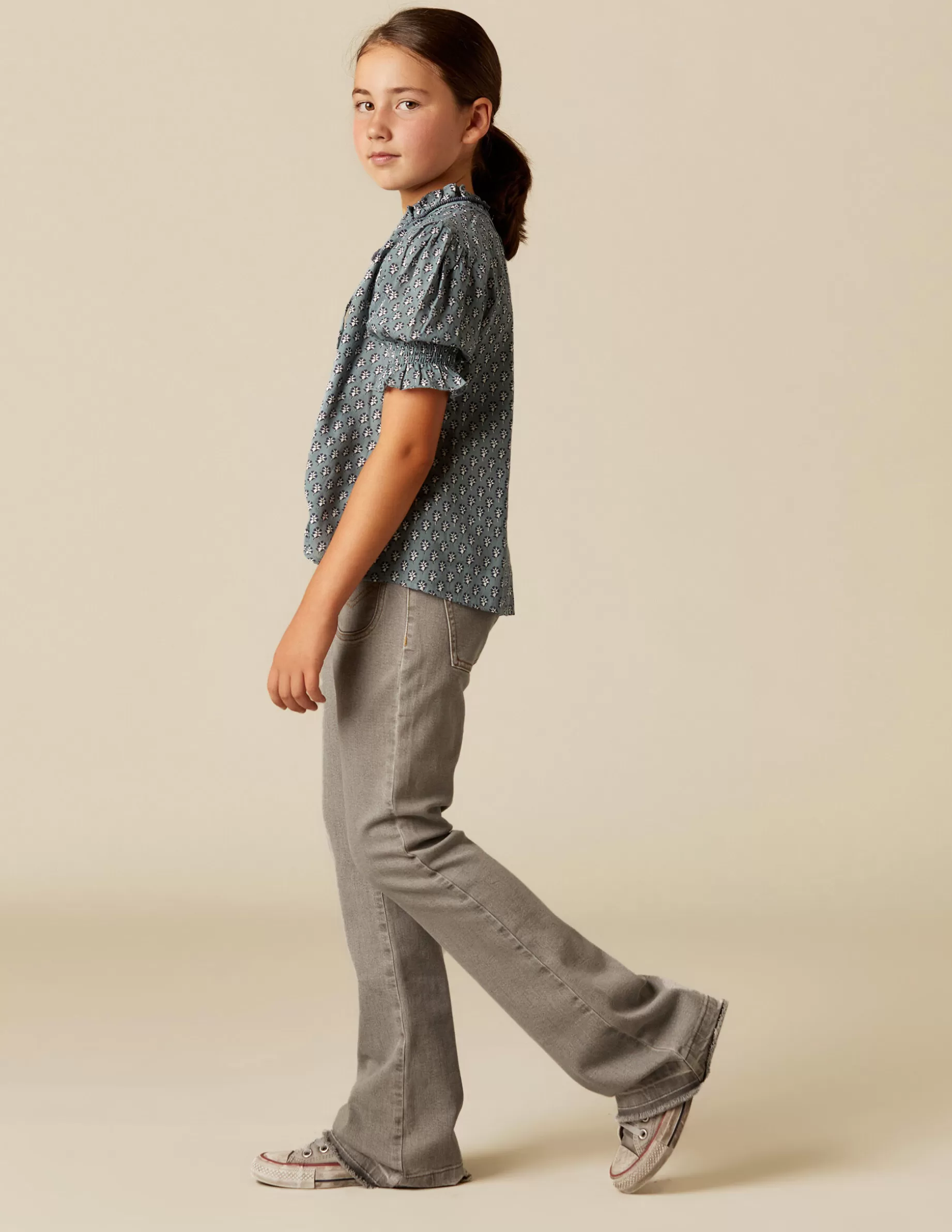 Pantalón campana vaquero. Lavado desgastado. Detalle de bolsillos y botones delanteros.
