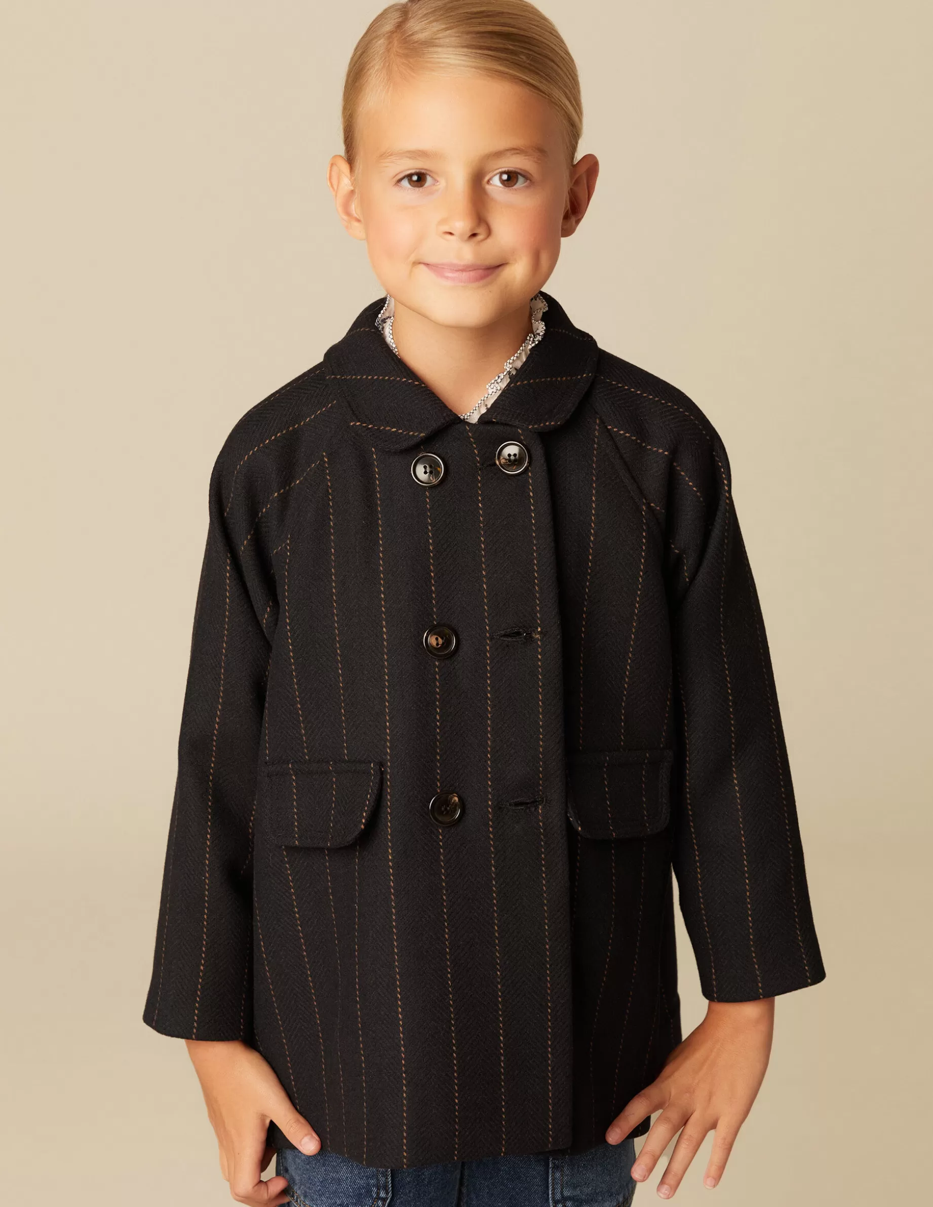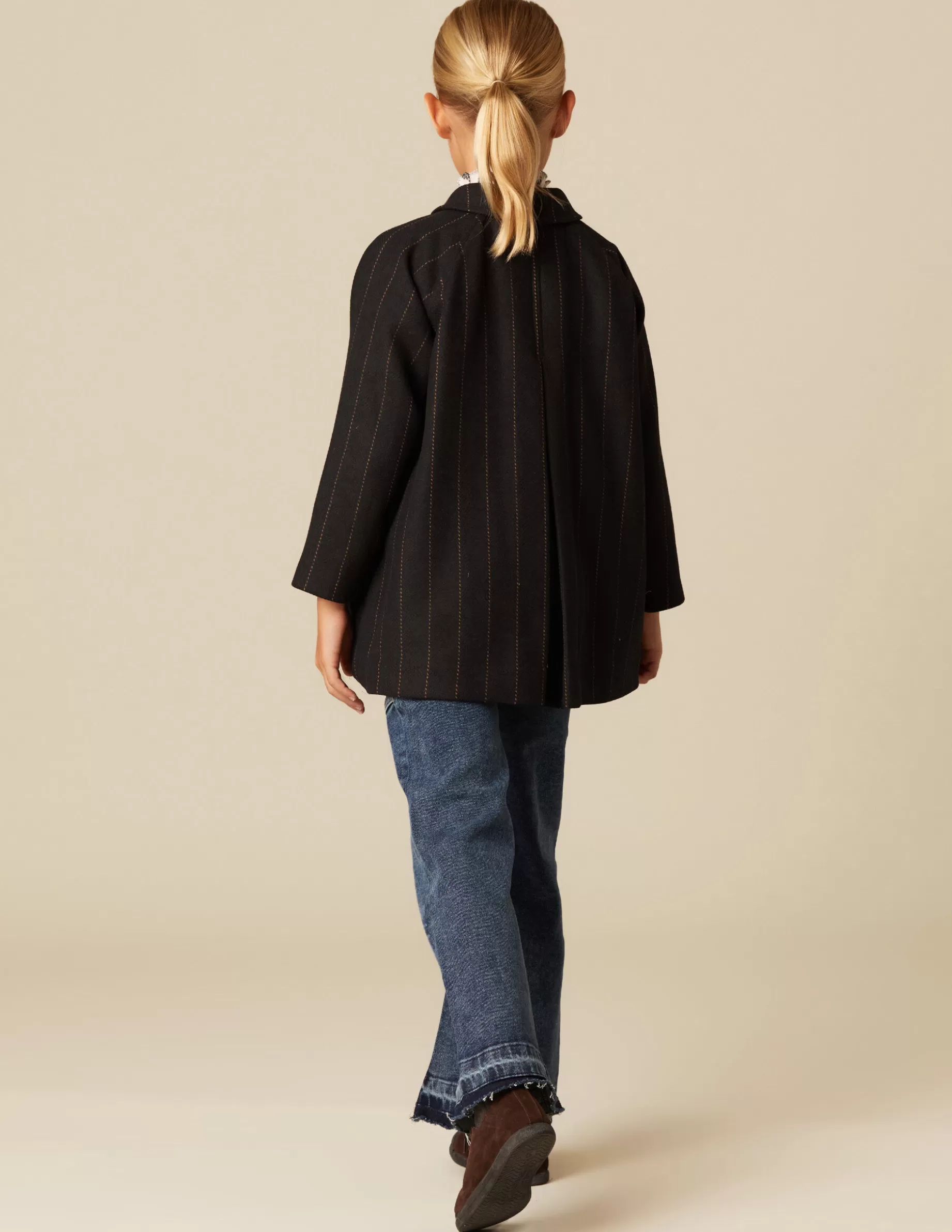 Abrigo de niña de vestir, en tejido de lana azul marino con rayas. Patrón clásico.