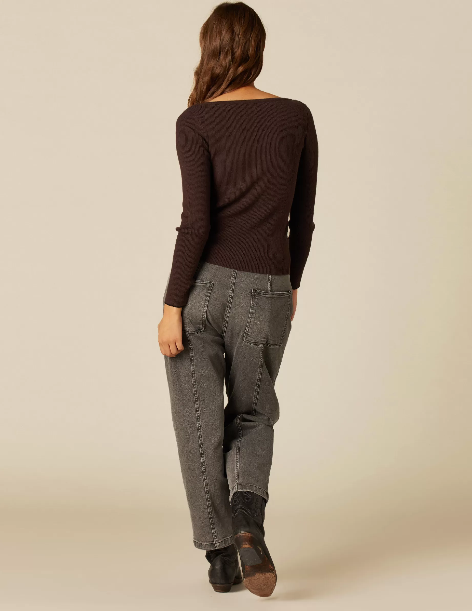 Top canalé manga larga y escote pico marrón.Detalle de cruce de botones con ribete a contraste en negro.