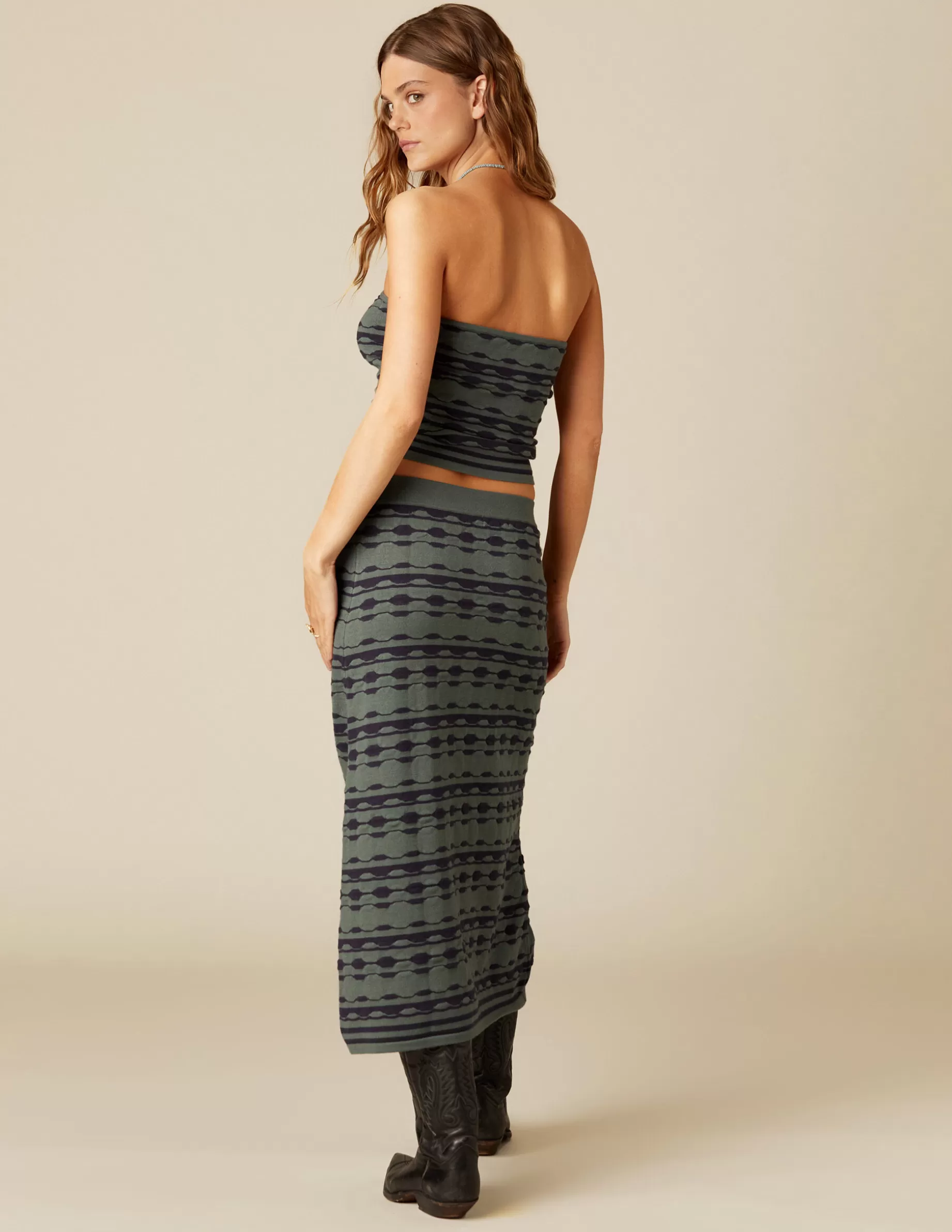 Falda larga en tejido de punto bicolor verde y azul.