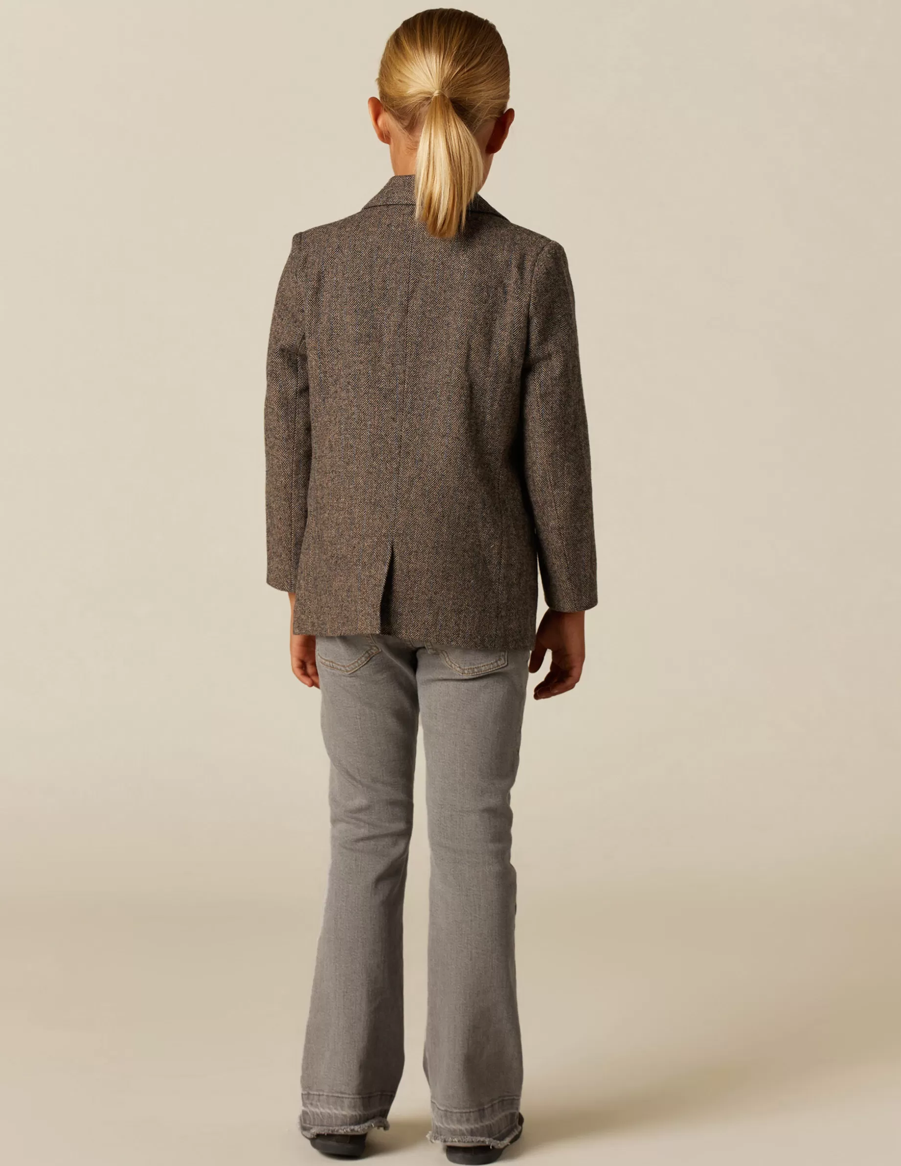 Blazer oversize espiga marrón raya azul. Cierre con botón delantero.