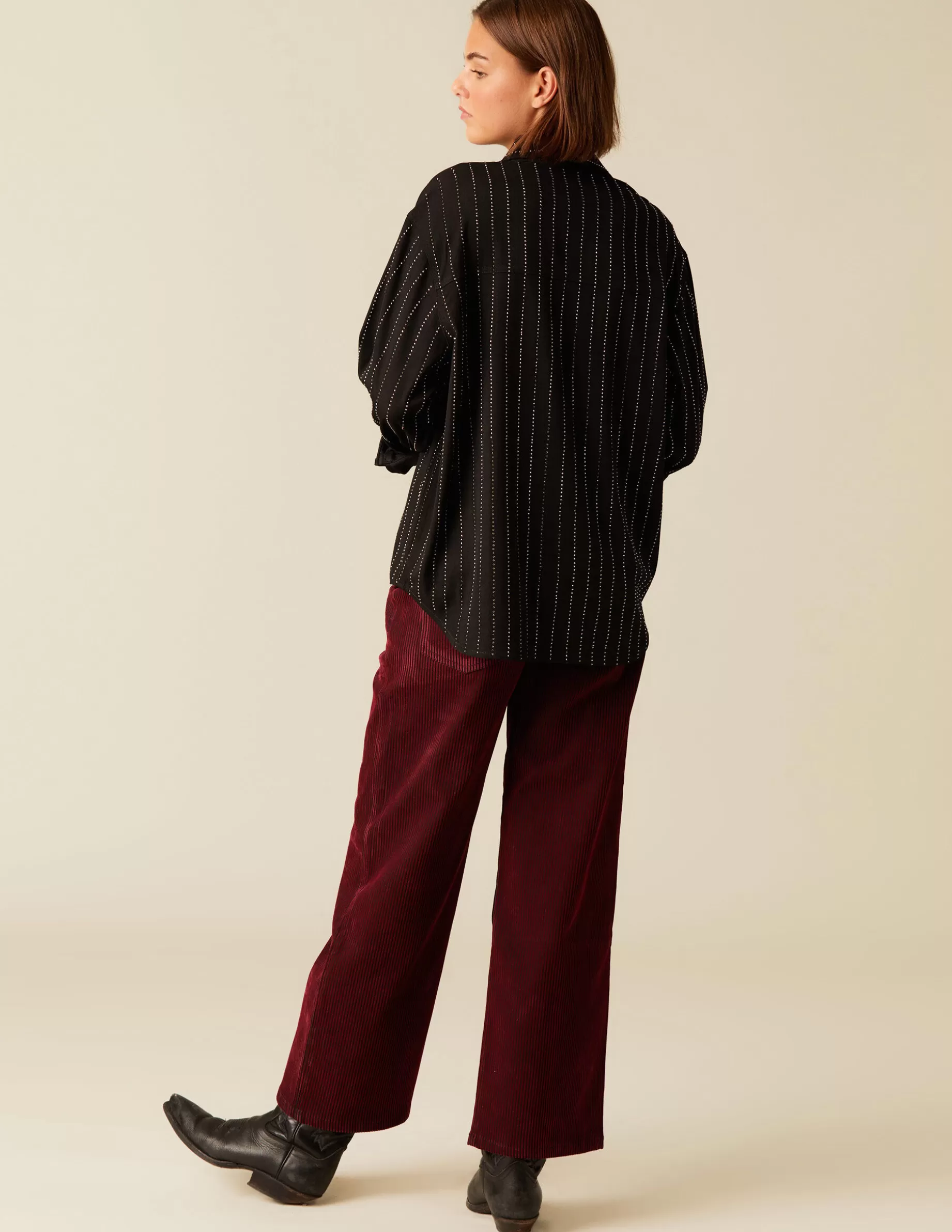 Pantalón largo en tejido de pana a rayas.Cierre con cremallera y botón.