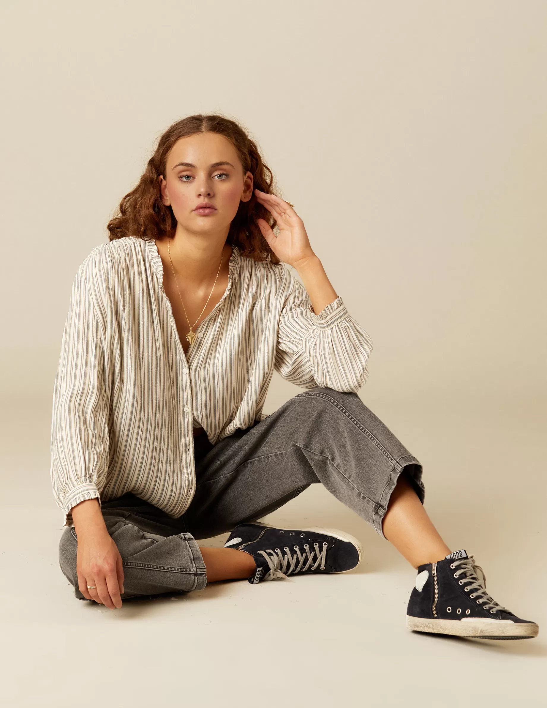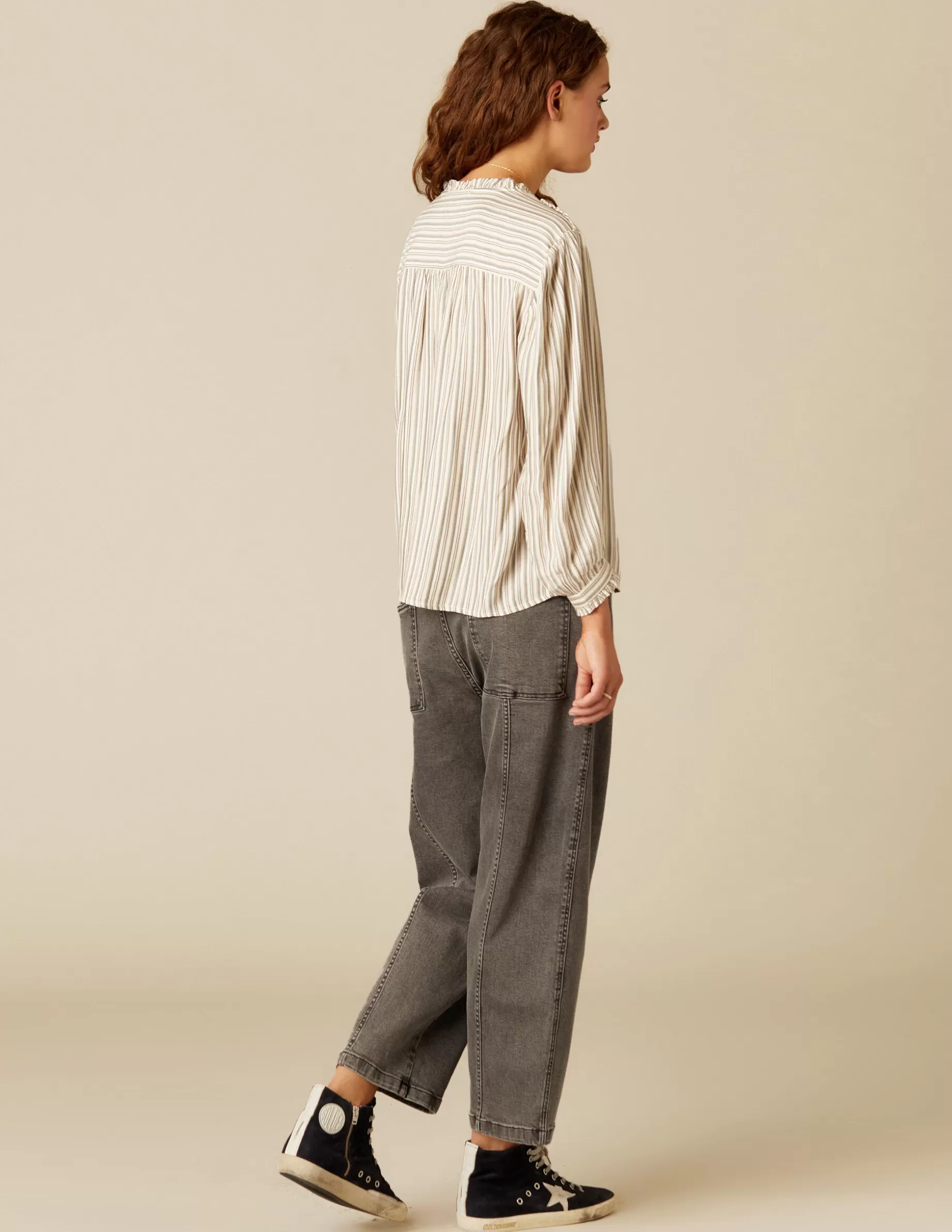 Camisa cruda de chica, con rayas en colorido de la colección. Patrón con cuello perkins, rematado con un volante que baja por la parte frontal, tapando los botones. Manga larga.