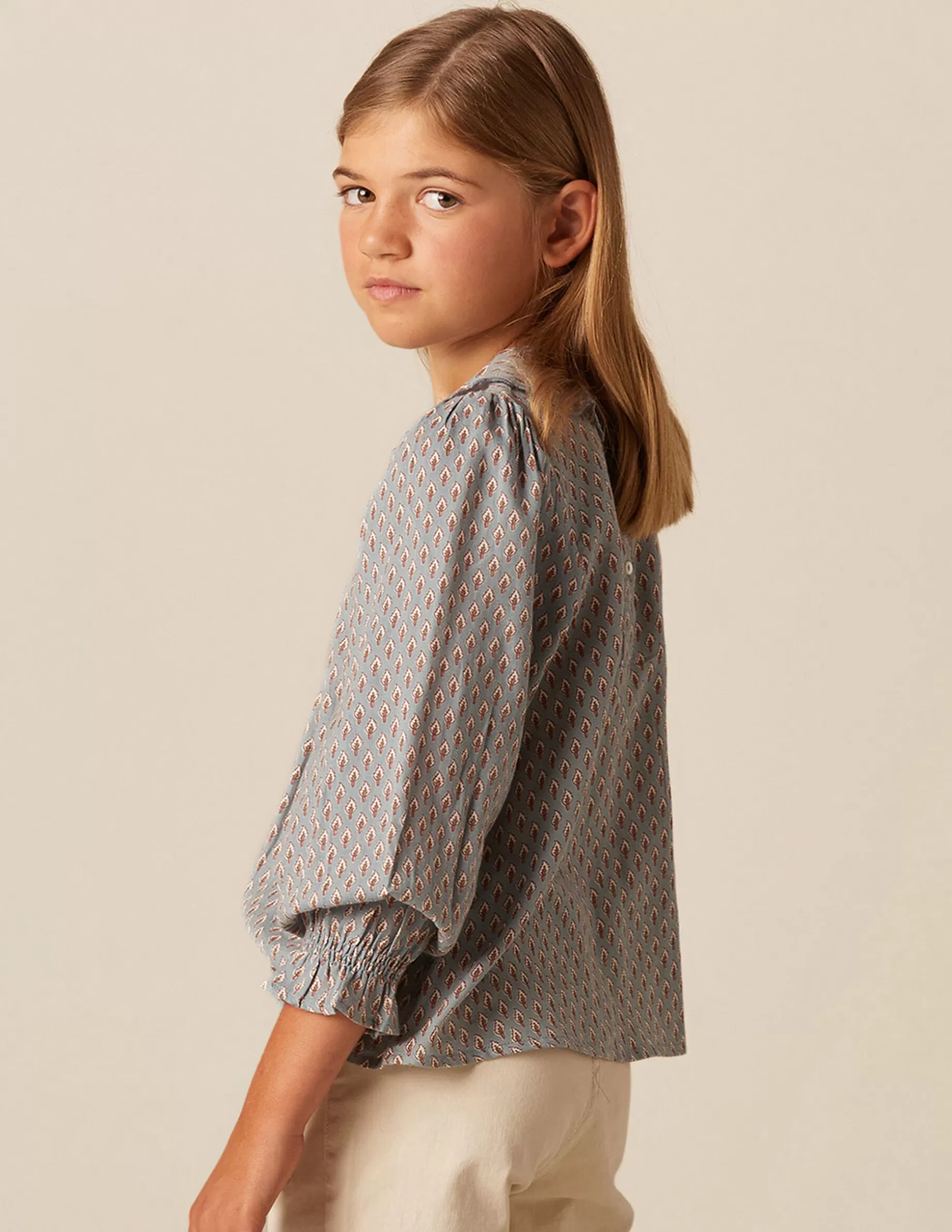 Camisa de teen, en print de la colección. Patrón con cuello XL, rematado con ondas a tono. Manga larga.