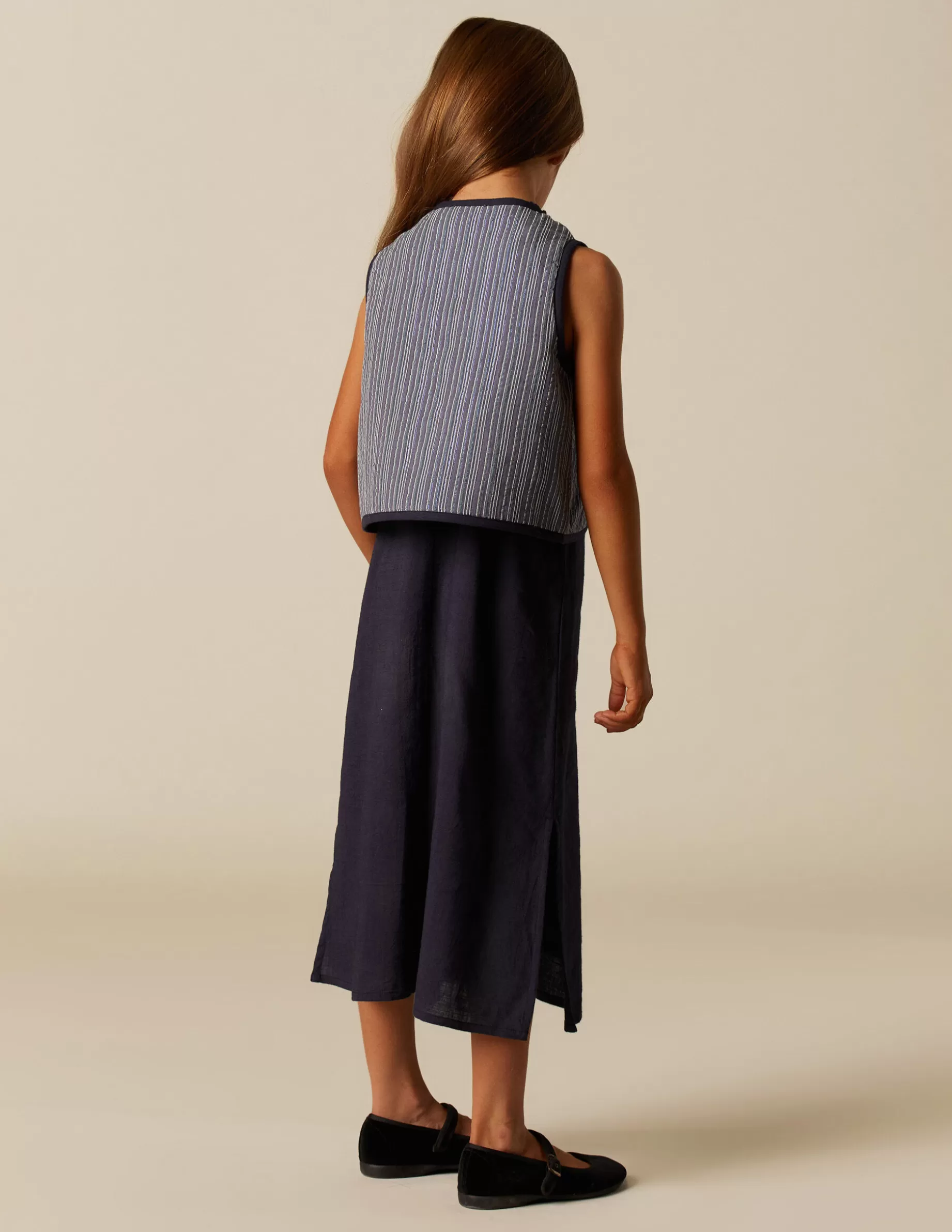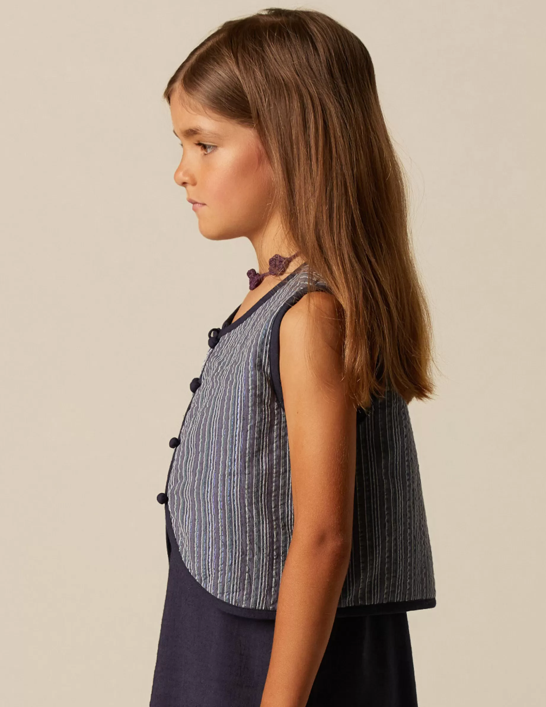 Chaleco de niña, en tejido de algodón con detalle de lurex. Vivo a tono. No tiene cierre.