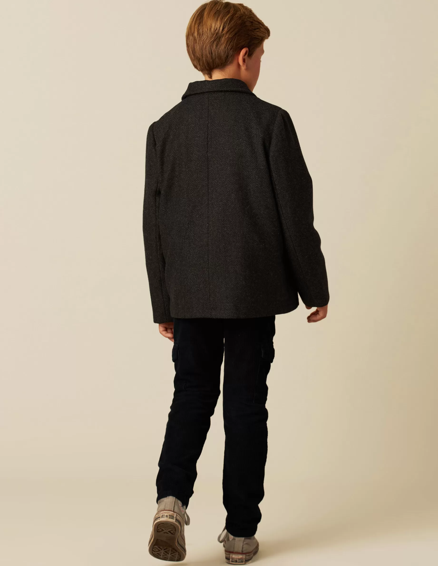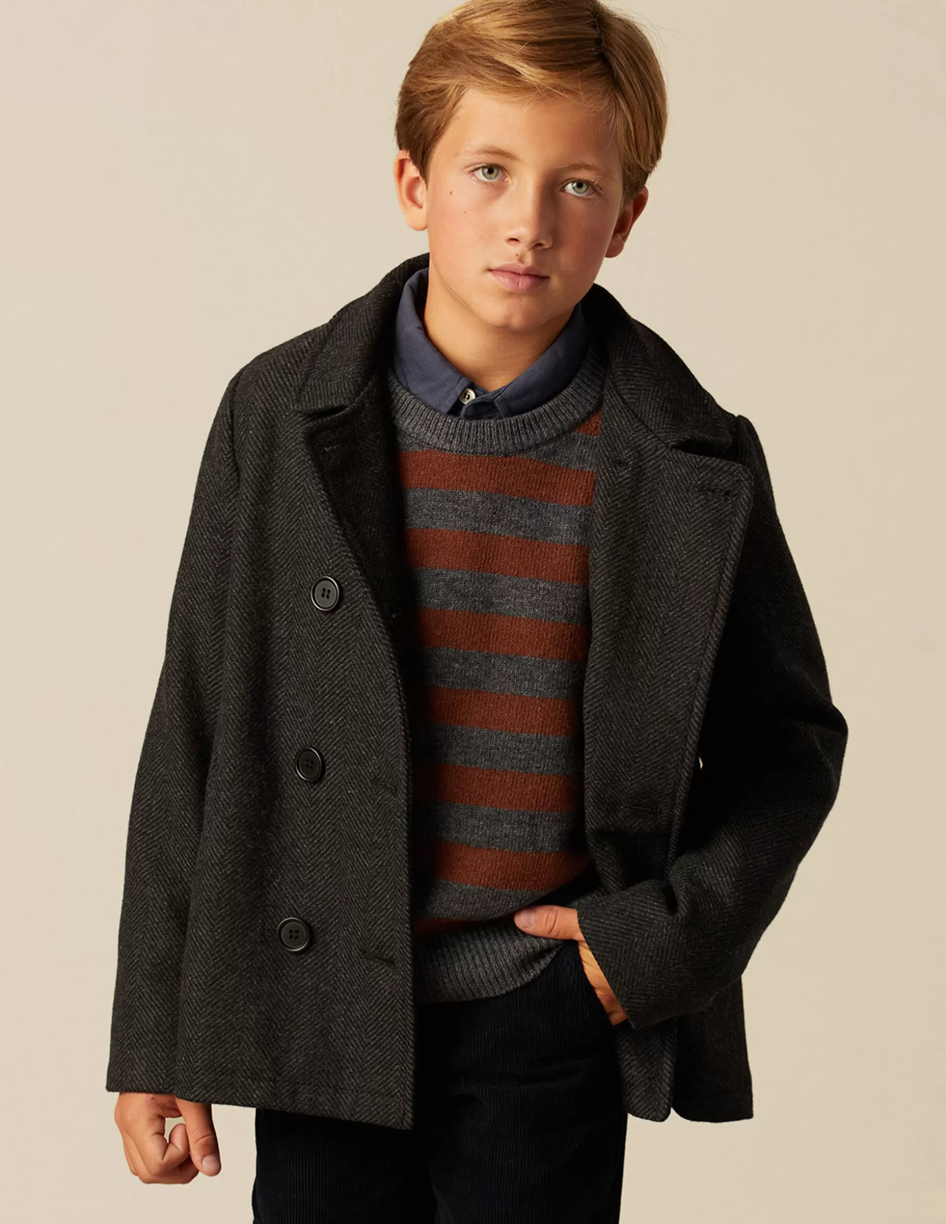 Abrigo cruzado en tejido espiga gris. Cierre con botonadura en delantero.