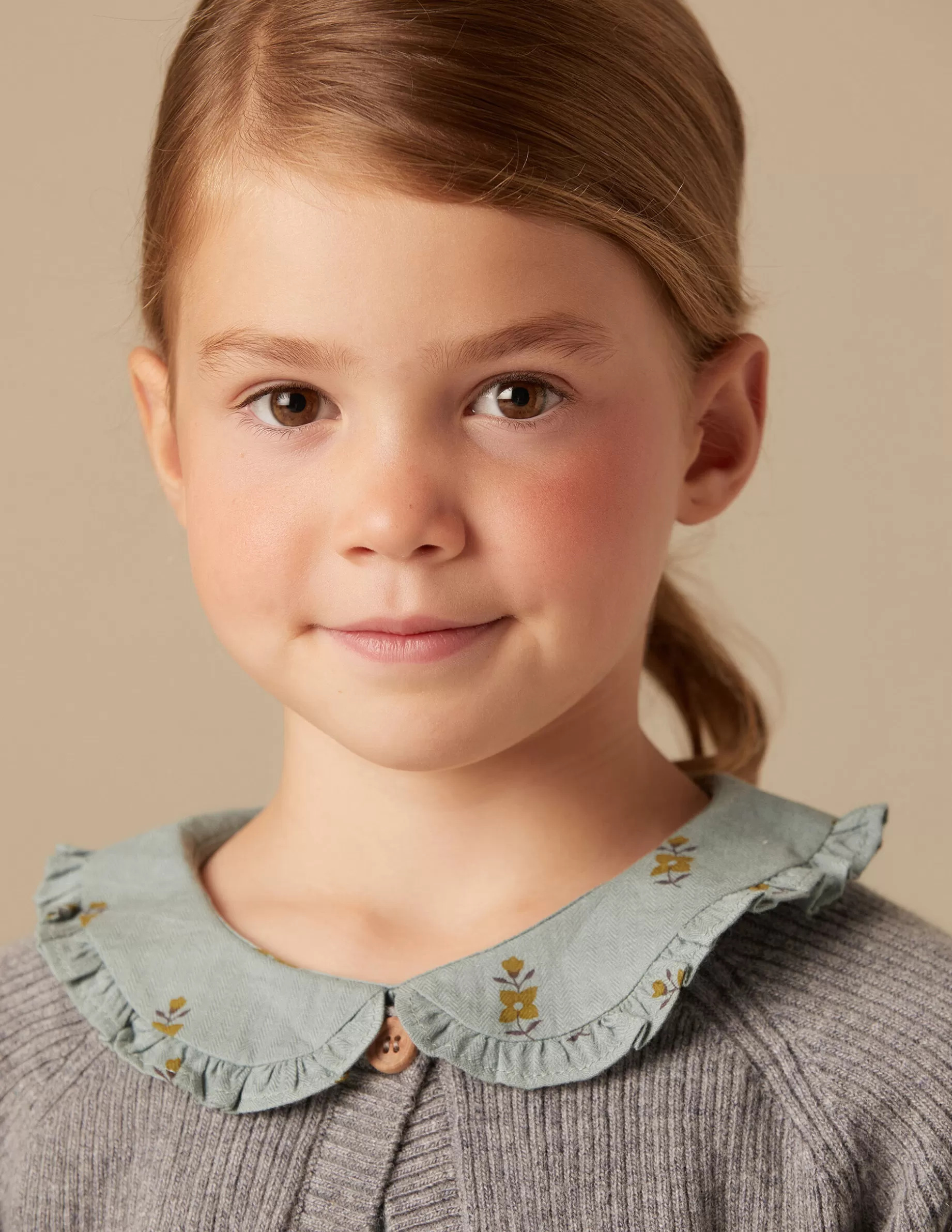 Chaqueta de punto corta canalé gris. Detalle cuello y cierre con botones delanteros.