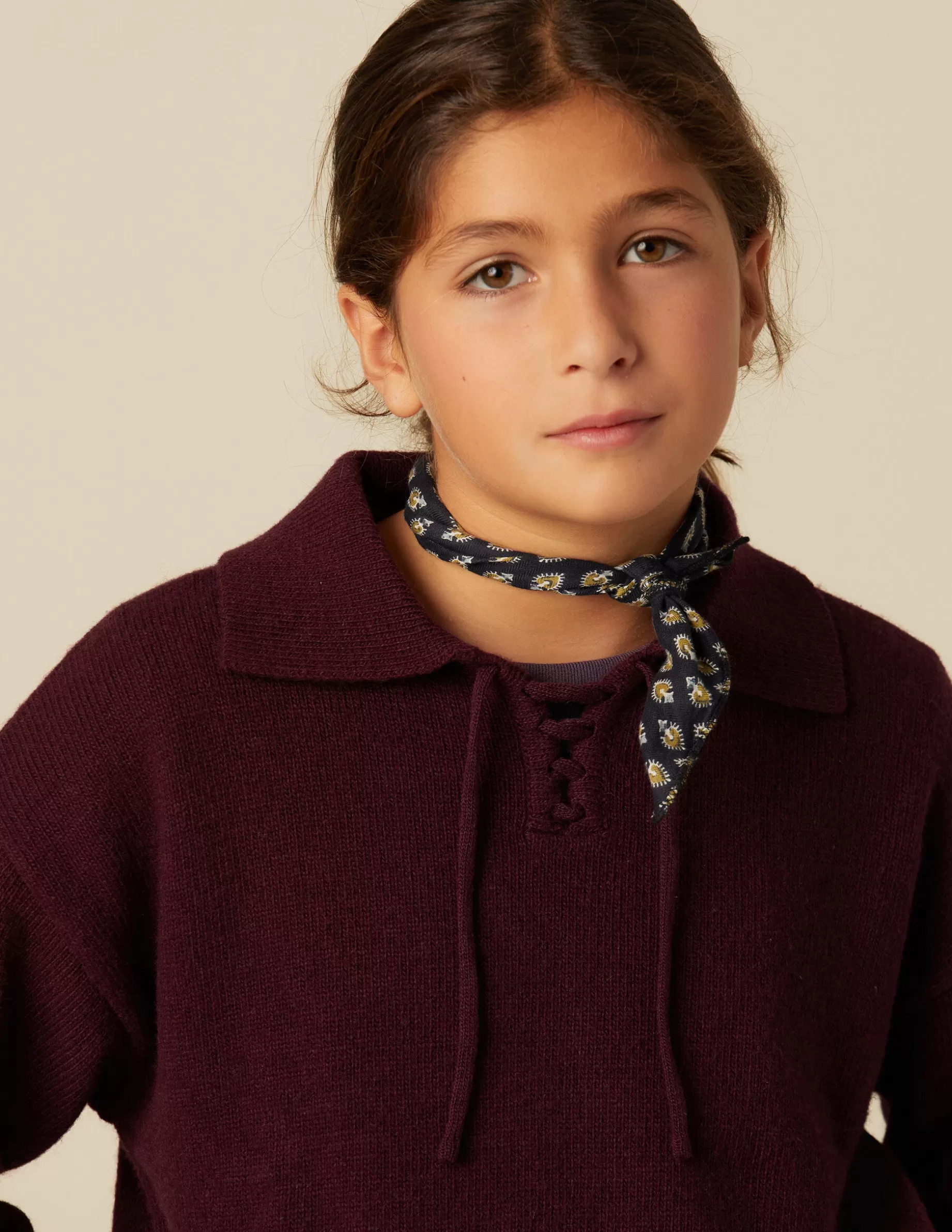 Jersey mora y cuello solapa con detalle de lazo.