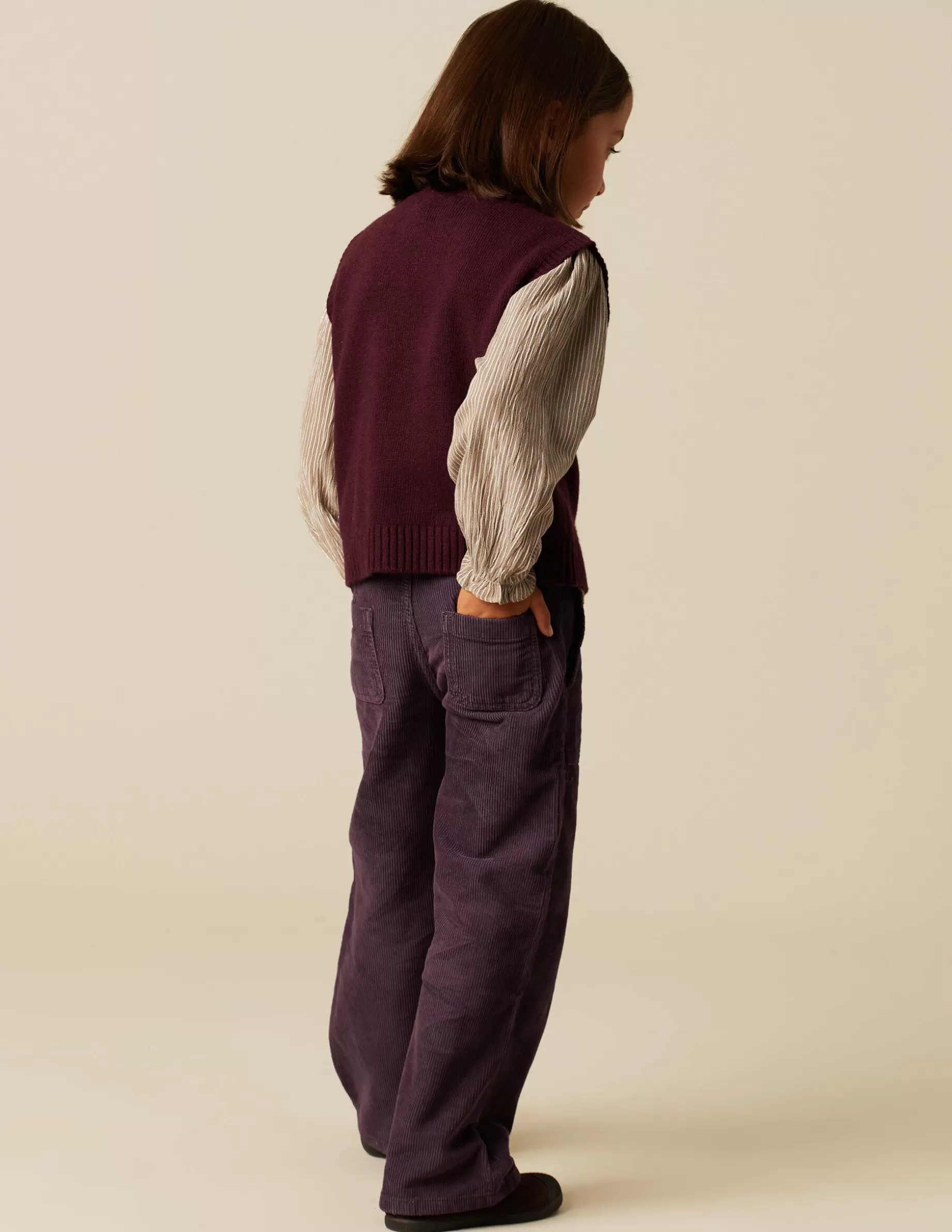 Pantalón wide leg de pana mora con bolsillos. Cierre con botón metálico y cremallera.