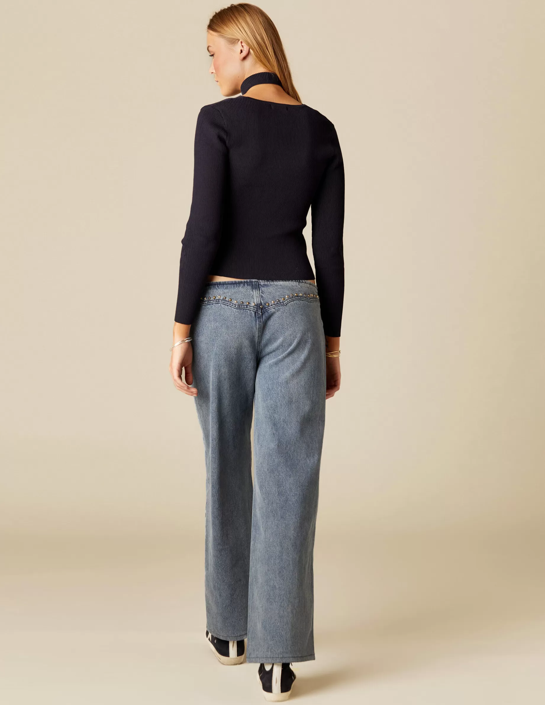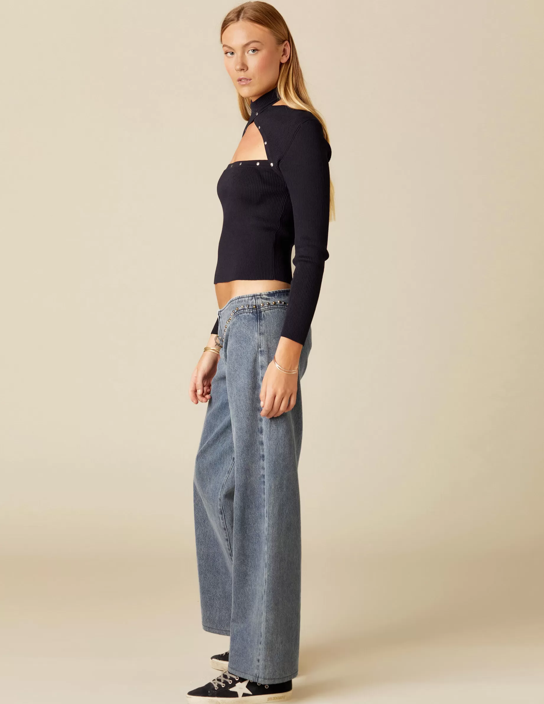 Top canalé con abertura en el escote, tachuelas alrededor de la abertura y manga larga en azul.