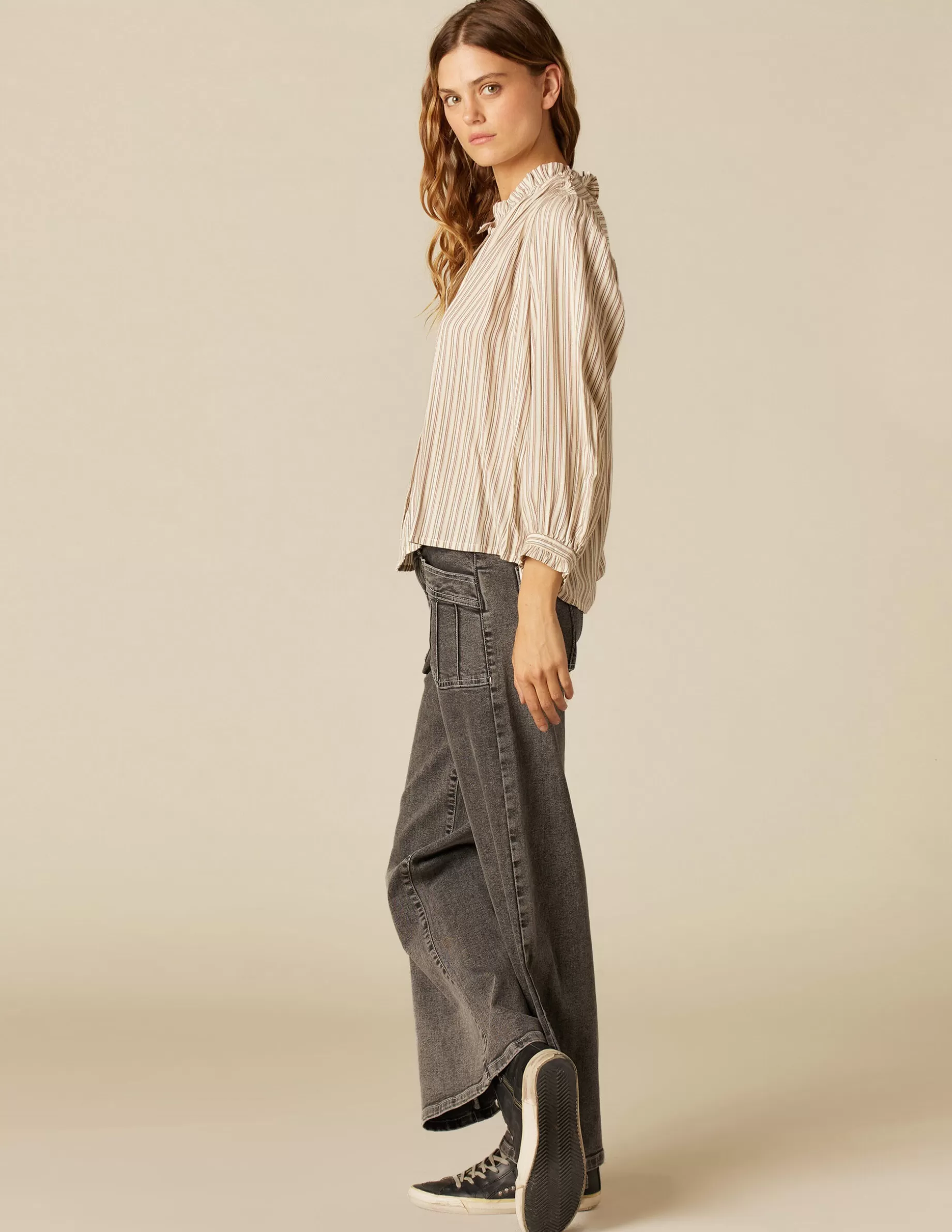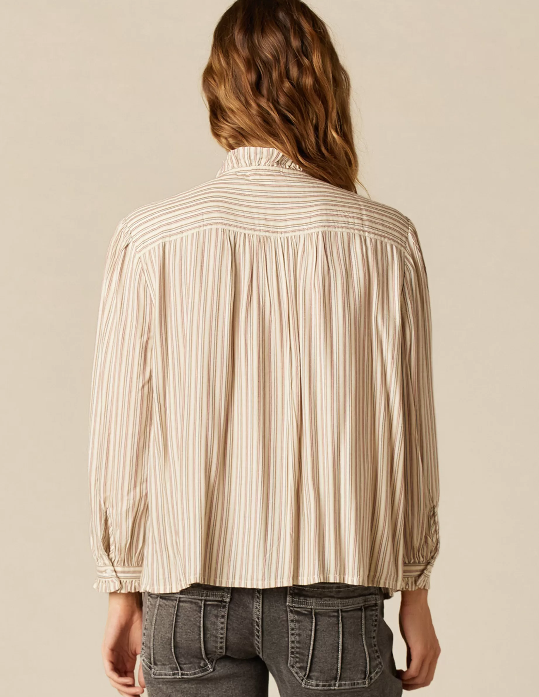 Camisa cruda de chica, con rayas en colorido de la colección. Patrón con cuello perkins, rematado con un volante que baja por la parte frontal, tapando los botones. Manga larga.