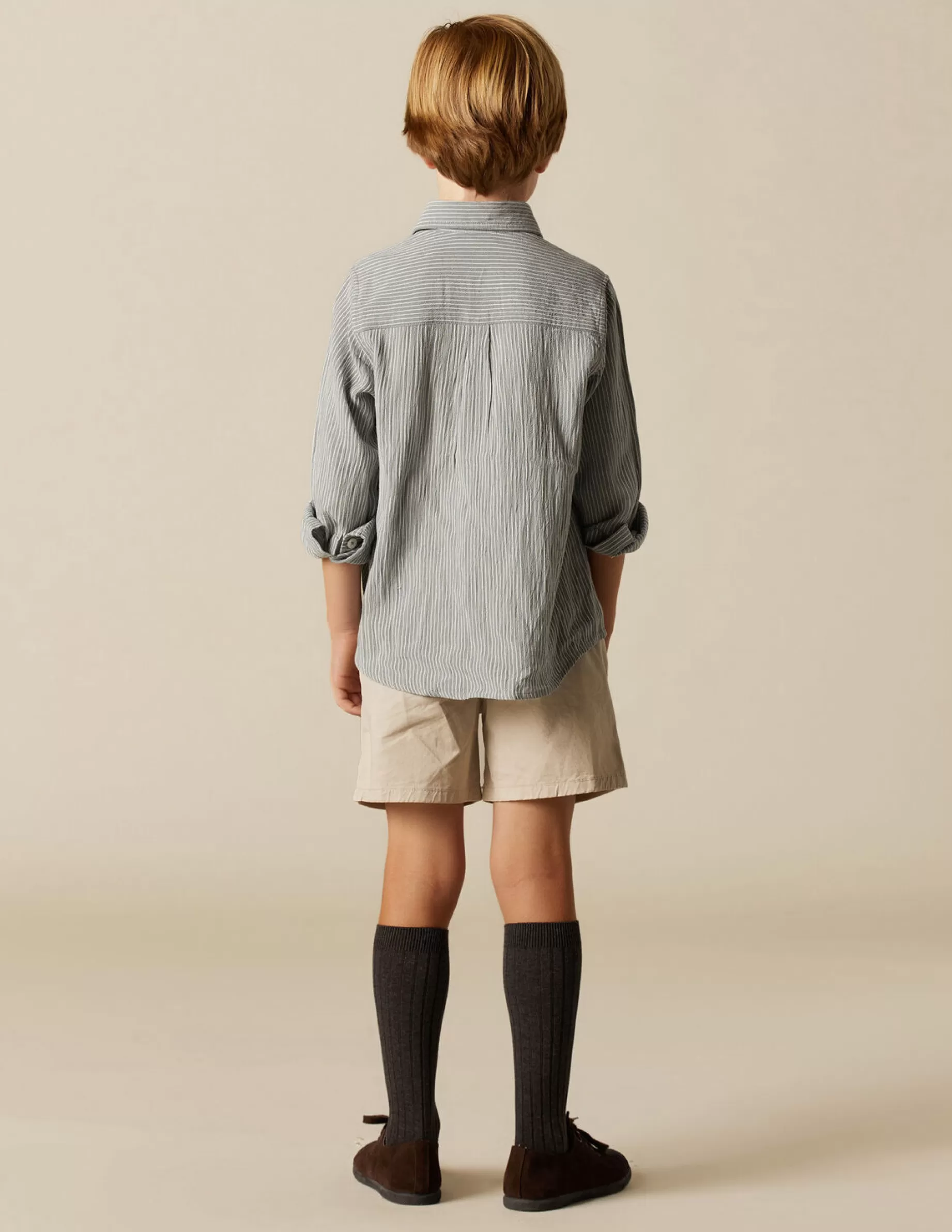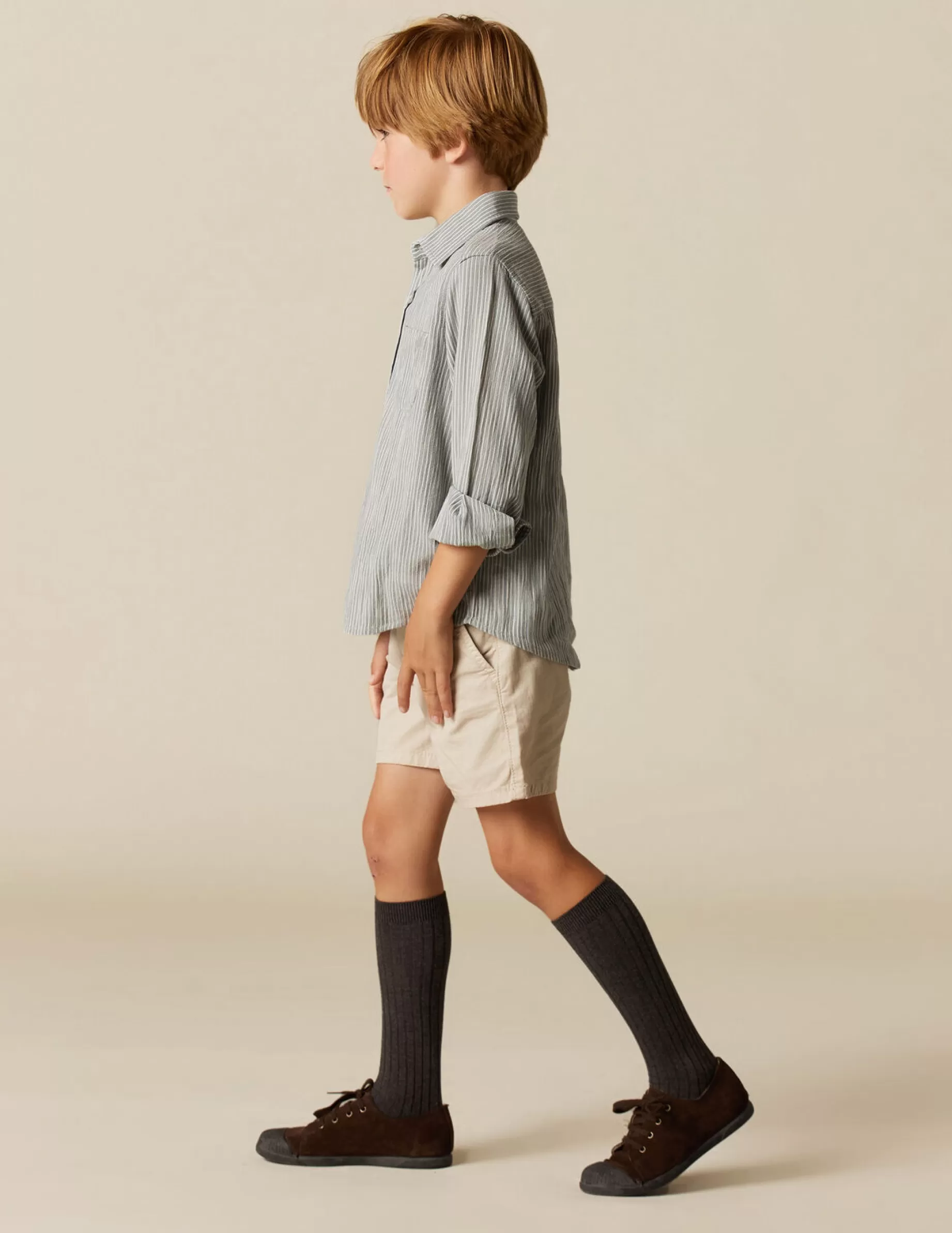 Pantalón chino corto de algodón lavado. Bolsillos frontales y detalle de bolsillos de vivo en espalda. Cierre frontal con cremallera y botón.