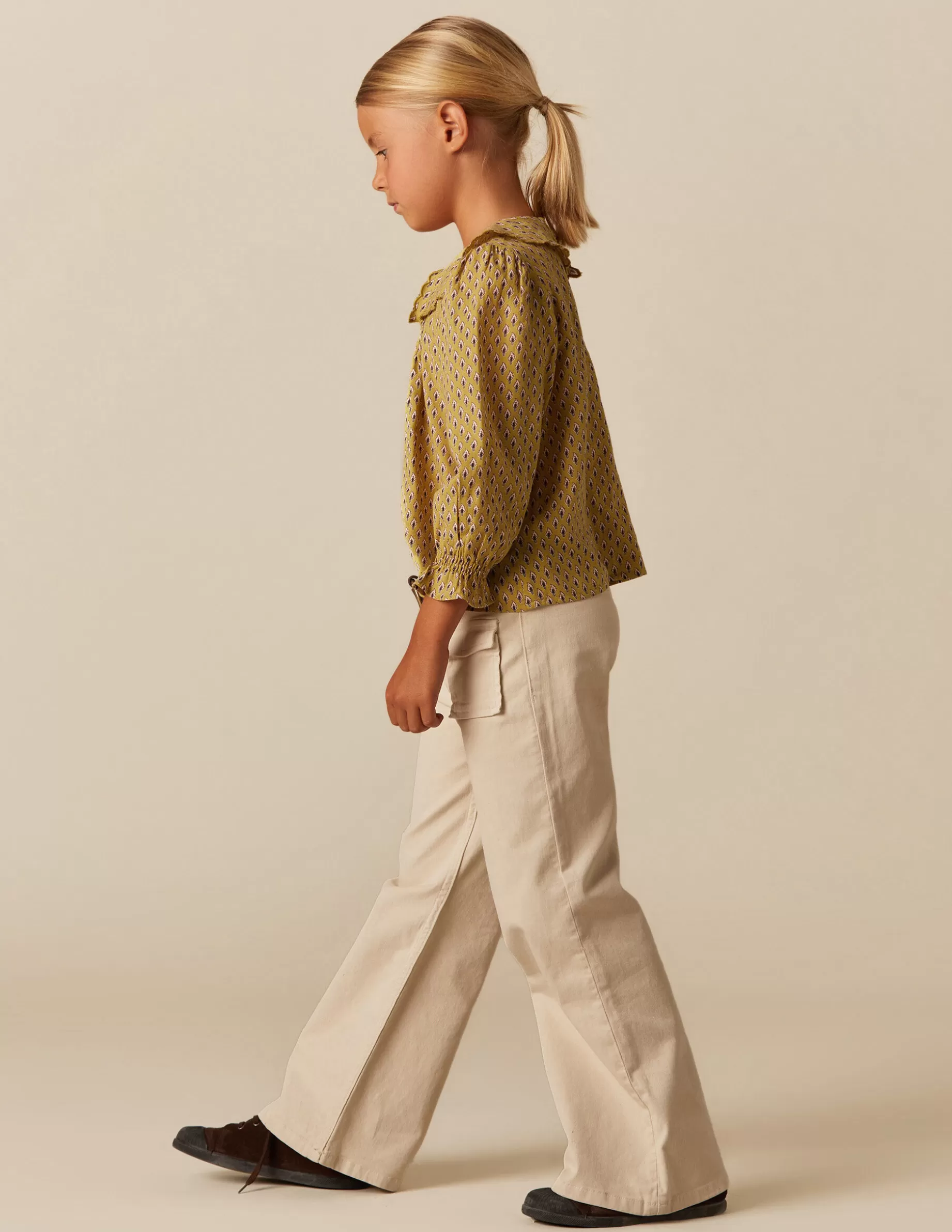 Pantalón ancho de algodón de tiro medio con detalle de bolsillos con tapeta. Cierre con cremallera y botón.